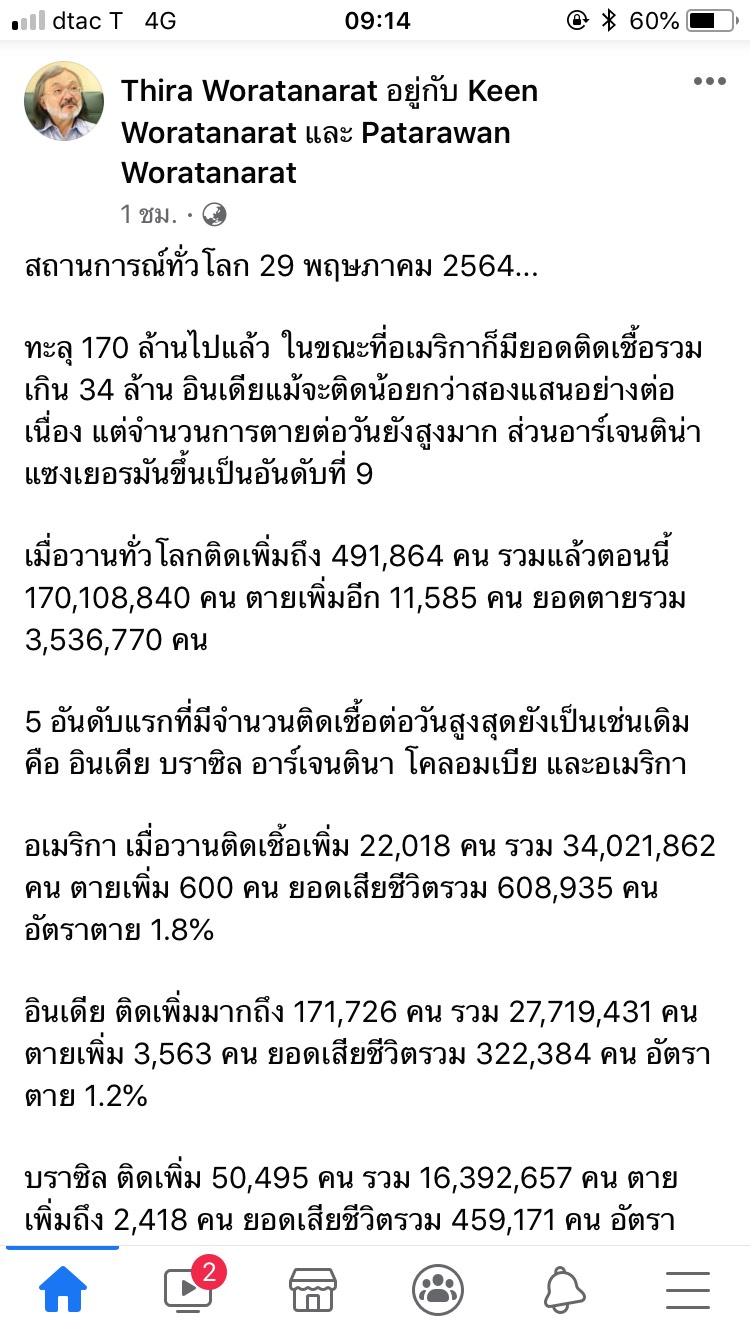 รศ.นพ.ธีระ วรธนารัตน์ คณะแพทยศาสตร์ จุฬาลงกรณ์มหาวิทยาลัย ได้โพสต์ข้อความผ่านเฟซบุ๊ก “Thira Woratanarat” โดยระบุข้อความว่า สถานการณ์ทั่วโลกทะลุ 170 ล้านไปแล้ว ในขณะที่อเมริกาก็มียอดติดเชื้อรวมเกิน 34 ล้าน อินเดียแม้จะติดน้อยกว่าสองแสนอย่างต่อเนื่อง แต่จำนวนการตายต่อวันยังสูงมาก ส่วนอาร์เจนติน่าแซงเยอรมันขึ้นเป็นอันดับที่ 9 เมื่อวานทั่วโลกติดเพิ่มถึง 491,864 คน รวมแล้วตอนนี้ 170,108,840 คน ตายเพิ่มอีก 11,585 คน ยอดตายรวม 3,536,770 คน