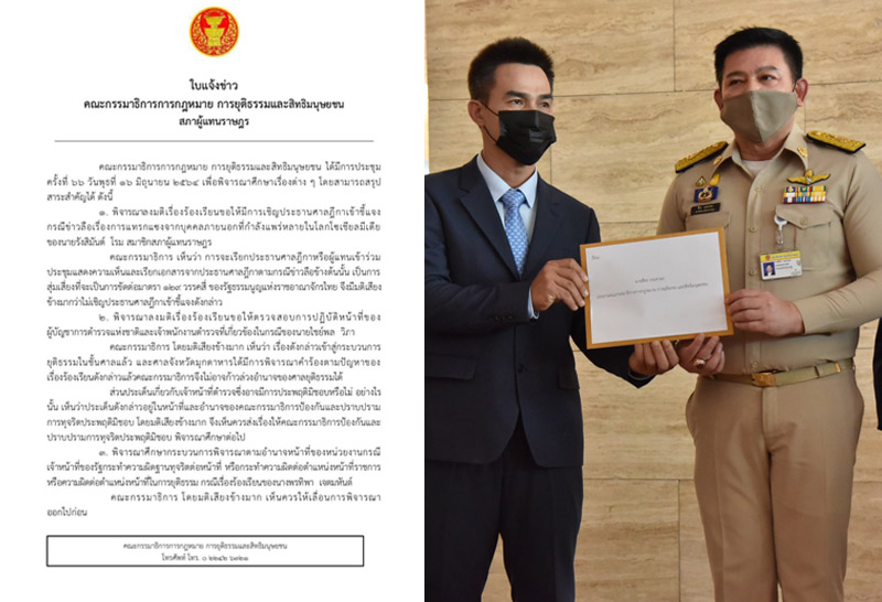 วันนี้ที่ประชุมมีมติแยกออกเป็น 2 ประเด็น คือ กรณีเจ้าหน้าที่ตำรวจยื่นคำร้องต่อศาลจังหวัดมุกดาหารเป็นเท็จเพื่อออกหมายจับ ซึ่งกรณีนี้ศาลมุกดาหารได้ยกคำร้องไปแล้ว และเรื่องดังกล่าวได้เข้าสู้กระบวรการยุติธรรมในชั้นศาลแล้ว ทางกรรมาธิการกฎหมายฯ จึงไม่อาจก้าวล่วงอำนาจของศาลยุติธรรมได้