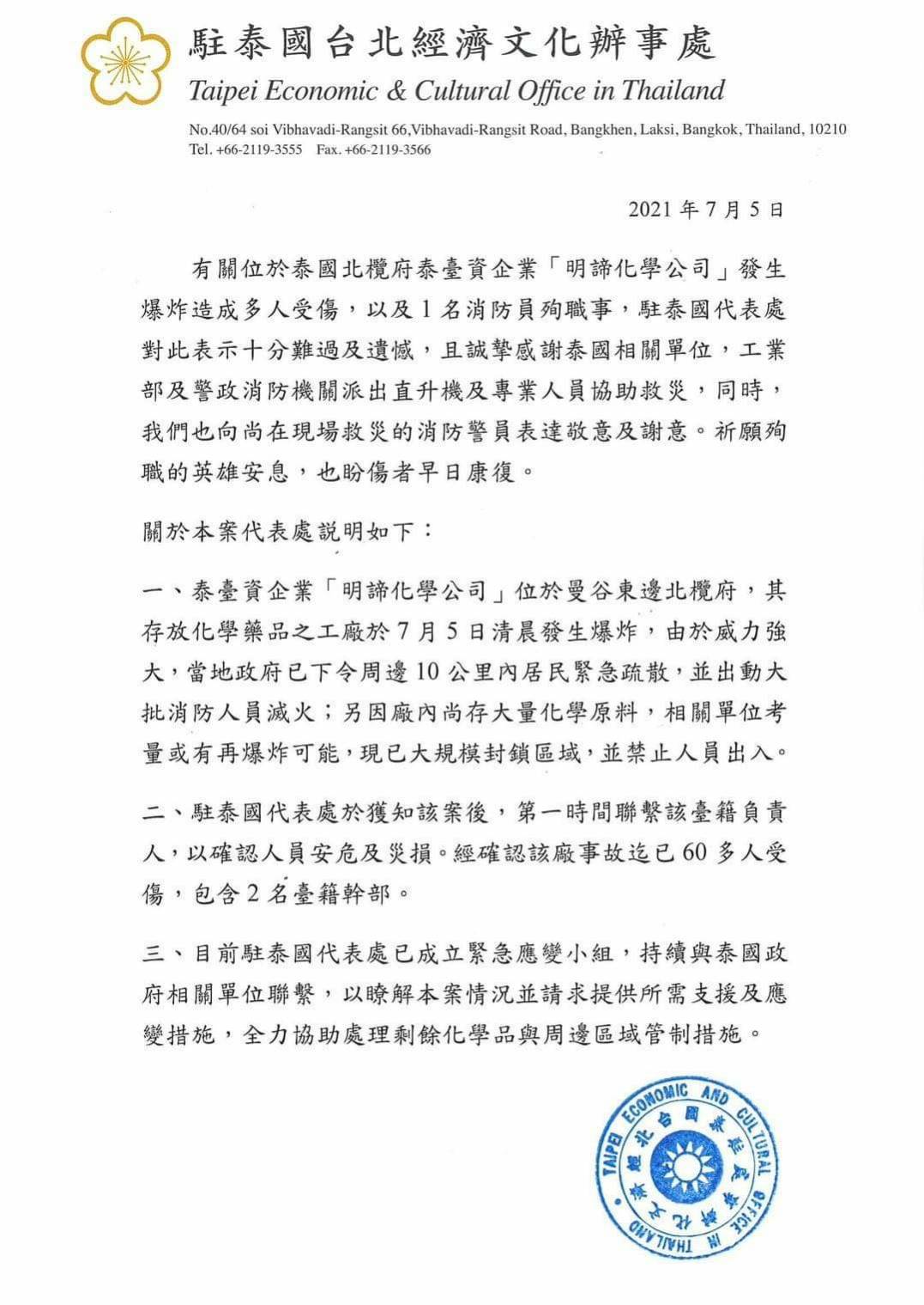 บริษัท หมิงตี้ เคมีคอล จำกัด ที่ไทยและไต้หวันร่วมทุนนั้นตั้งอยู่ที่จ.สมุทรปราการ ฝั่งตะวันออกของกรุงเทพฯ เกิดเหตุระเบิดช่วงเช้ามืดเมื่อวันที่ 5 ก.ค.ที่ผ่านมา เนื่องจากแรงระเบิดสร้างความเสียหายเป็นวงกว้าง ขณะที่หน่วยงานปกครองส่วนท้องถิ่นได้ออกคำสั่งอพยพประชาชนออกจากพื้นที่ในรัศมี 10 กิโลเมตร พร้อมส่งเจ้าหน้าที่ดับเพลิงจำนวนมากช่วยดับเพลิง เนื่องจากภายในโรงงานยังมีสารเคมีอยู่อีกจำนวนมาก หน่วยงานที่เกี่ยวข้องหวั่นเกิดอันตรายจากการระเบิดซ้ำ ขณะนี้ได้ปิดพื้นที่โดยรอบและห้ามผู้คนเข้าออก หลังทราบเหตุดังกล่าว สำนักงานฯ ได้ติดต่อผู้บริหารชาวไต้หวันทันที เพื่อตรวจสอบความปลอดภัยของผู้คนและความเสียหายที่เกิดขึ้น ซึ่งหลังการตรวจสอบพบว่าขณะนี้มีผู้ได้รับบาดเจ็บจำนวน 60 กว่าราย โดยมี 2 รายเป็นพนักงานชาวไต้หวันของบริษัทดังกล่าว