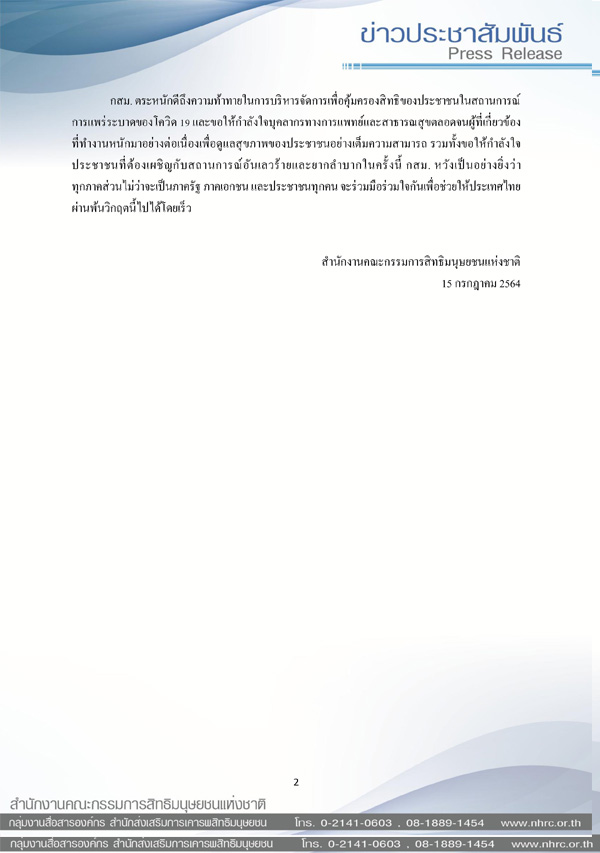 กสม.ออกแถลงการณ์ ติดตามโควิด แนะรัฐปกป้องคุ้มครองสิทธิของประชาชน ขอทุกภาคส่วนร่วมมือร่วมใจช่วยให้ประเทศไทยผ่านพ้นวิกฤต