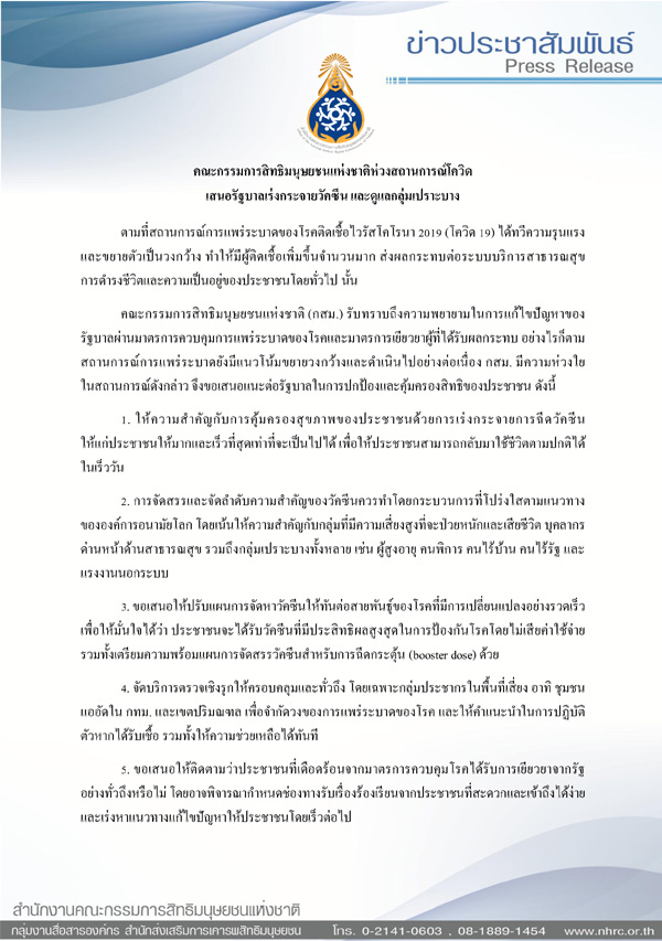 กสม.ออกแถลงการณ์ ติดตามโควิด แนะรัฐปกป้องคุ้มครองสิทธิของประชาชน ขอทุกภาคส่วนร่วมมือร่วมใจช่วยให้ประเทศไทยผ่านพ้นวิกฤต