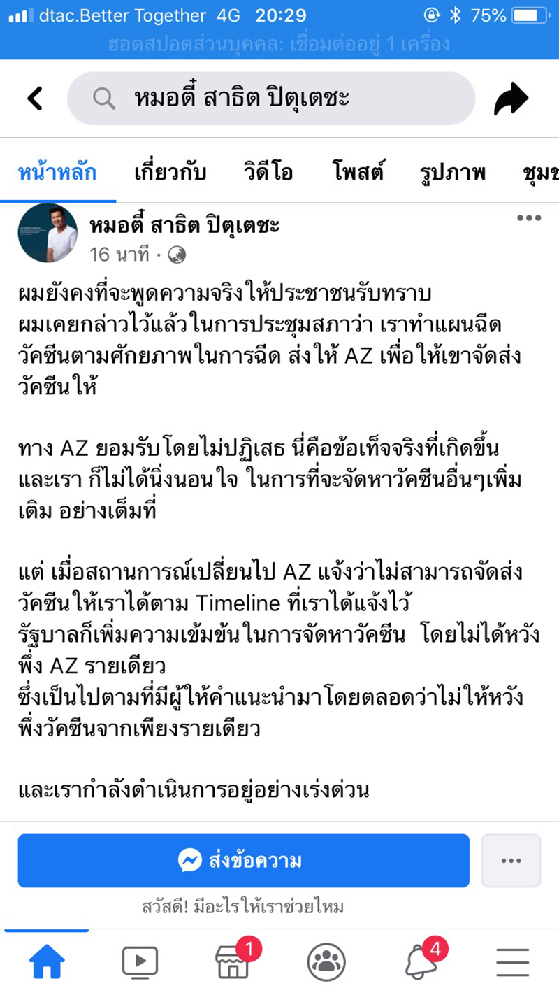 นายสาธิต ปิตุเตชะ รัฐมนตรีช่วยว่าการกระทรวงสาธารณสุข โพสต์ข้อความผ่านเพจ “หมอตี๋ สาธิต ปิตุเตชะ” ว่า ผมยังคงที่จะพูดความจริงให้ประชาชนรับทราบ ผมเคยกล่าวไว้แล้วในการประชุมสภาว่า เราทำแผนฉีดวัคซีนตามศักยภาพในการฉีด ส่งให้ AZ เพื่อให้เขาจัดส่งวัคซีนให้