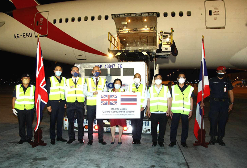 วัคซีนจากการบริจาคของรัฐบาลสหราชอาณาจักร เดินทางถึงสนามบินสุวรรณภูมิ เมื่อเวลาประมาณ 21.00 น. นับเป็นอีกหนึ่งก้าวสำคัญของเราทุกคนที่จะก้าวผ่านวิกฤตครั้งนี้ไปด้วยกัน ด้วยการช่วยลดการระบาดของโรคโควิด-19 ในประเทศไทย โดยจุดประสงค์ของการบริจาคเพื่อช่วยกระจายวัคซีนให้ถึงประชาชนทั่วประเทศมากขึ้นอย่างเท่าเทียม ทั้งนี้นายแพทย์โสภณ เอี่ยมศิริถาวร รองอธิบดีกรมควบคุมโรค และนางจุฬามณี ชาติสุวรรณ อธิบดีกรมยุโรป กระทรวงการต่างประเทศ เป็นตัวแทนรัฐบาลไทยรับมอบวัคซีนออกซฟอร์ด-แอสตราเซเนกา จำนวน 415,000 โดสในคืนนี้