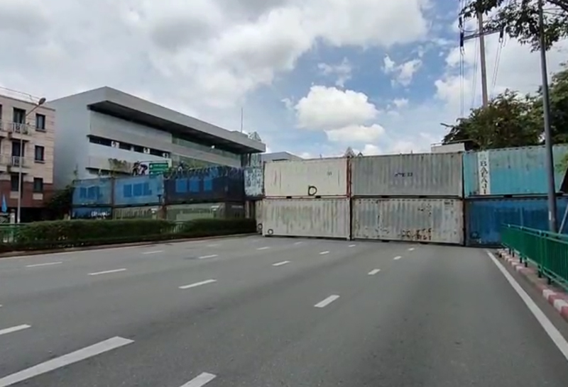 ราชมงคลพระนคร โดยเจ้าหน้าที่ก็ได้นำตู้คอนเทนเนอร์และลวดหนามมาติดตั้งปิดการจราจร