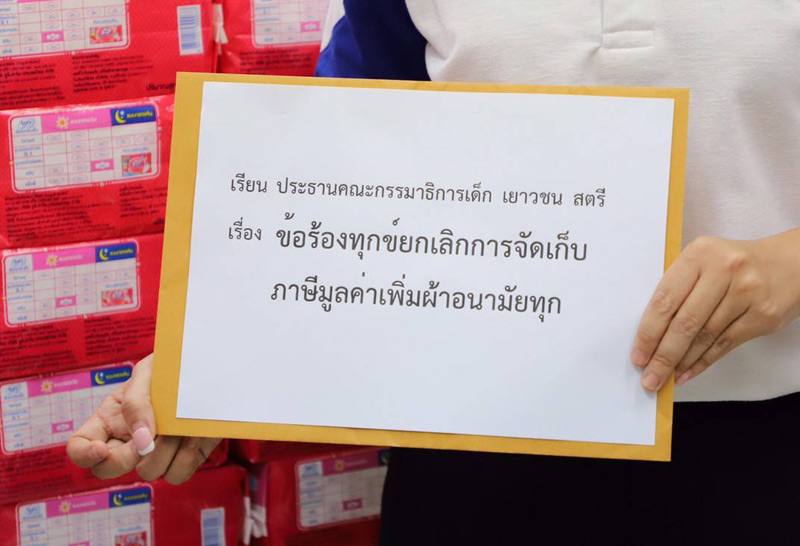 นางสาวอรุณี กาสยานนท์ โฆษกพรรคเพื่อไทยในฐานะที่ปรึกษาประธานคณะกรรมาธิการกิจการเด็ก เยาวชน สตรี ผู้สูงอายุ ผู้พิการ กลุ่มชาติพันธุ์ และผู้มีความหลากหลายทางเพศ และผู้แทนคณะทำงานนโยบายสตรีพรรคเพื่อไทย, นางสาวธีรรัตน์ สำเร็จวาณิชย์ ส.ส.กทม. พรรคเพื่อไทย เขตลาดกระบัง, นางสาวขัตติยา สวัสดิผล, และนางสาวชยิกา วงศ์นภาจันทร์ ร่วมรับหนังสือร้องเรียน จากนางสาวณฤดี จินตวิโรจน์ และนางสาวชนิสรา โสกันต์ ในนามผู้ประสานงานแคมเปญรณรงค์ยกเลิกการจัดเก็บภาษีมูลค่าเพิ่ม ผ้าอนามัย ทุกรูปแบบ ที่ได้ร่วมกันเข้ารายชื่อผ่านเว็บไซต์ change.org