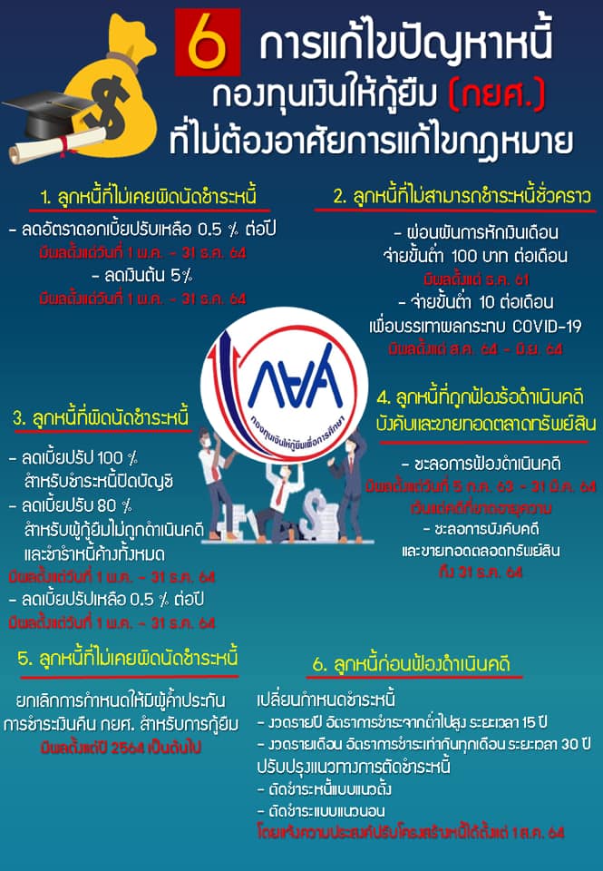 ในปัจจุบันมีการกู้ยืมเงินของ กยศ. มากกว่า 5 ล้านราย รวมเป็นวงเงินมากกว่า 6 แสนล้านบาท แต่ยังมีปัญหาการผิดนัดชำระหนี้สูงถึงมากกว่า 60% และยังได้รับผลกระทบจากสถานการณ์โควิด-19 ที่เกิดขึ้น ซึ่งที่ผ่านมา รัฐบาลให้สั่งการให้คณะกรรมการ กยศ. ได้แนวทางในการช่วยเหลือลูกหนี้ กยศ. ซึ่งตั้งแต่ต้นปีที่ผ่านมา ได้ออกมาตรการจำนวนมากเพื่อช่วยเหลือลูกหนี้ประเภทต่างๆ