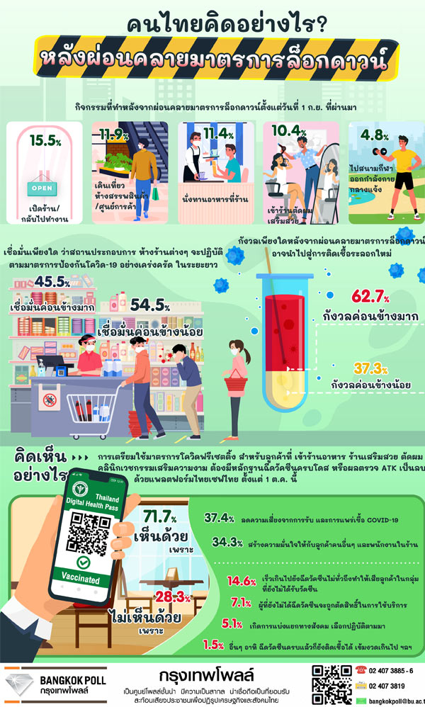 กรุงเทพโพลล์ ประชาชน 62.7% กังวลหลังจากผ่อนคลายล็อกดาวน์อาจนำสู่ระบาดระลอกใหม่ 71.7% หนุนใช้มาตรการโควิดฟรีเซตติ้ง แต่ 54.5% เชื่อมั่นน้อยว่าสถานประกอบการจะเข้มโควิด