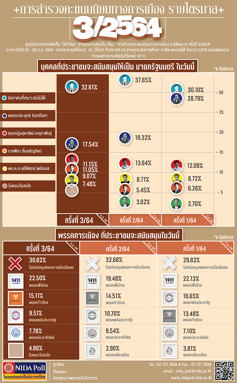 และเมื่อเปรียบเทียบกับผลการสำรวจคะแนนนิยมทางการเมือง รายไตรมาส ครั้งที่ 2/64 เดือนมิถุนายน 2564 พบว่า ผู้ที่ระบุว่า ยังหาคนที่เหมาะสมไม่ได้ พลเอกประยุทธ์ จันทร์โอชา คุณหญิงสุดารัตน์ เกยุราพันธุ์ นายกรณ์ จาติกวณิช และนายอนุทิน ชาญวีรกูล มีสัดส่วนลดลง ในขณะที่ผู้ที่ระบุว่า นายพิธา ลิ้มเจริญรัตน์ พล.ต.อ.เสรีพิศุทธ์ เตมียเวส นายสมพงษ์ อมรวิวัฒน์ และไม่ตอบ/ไม่สนใจ มีสัดส่วนเพิ่มขึ้น