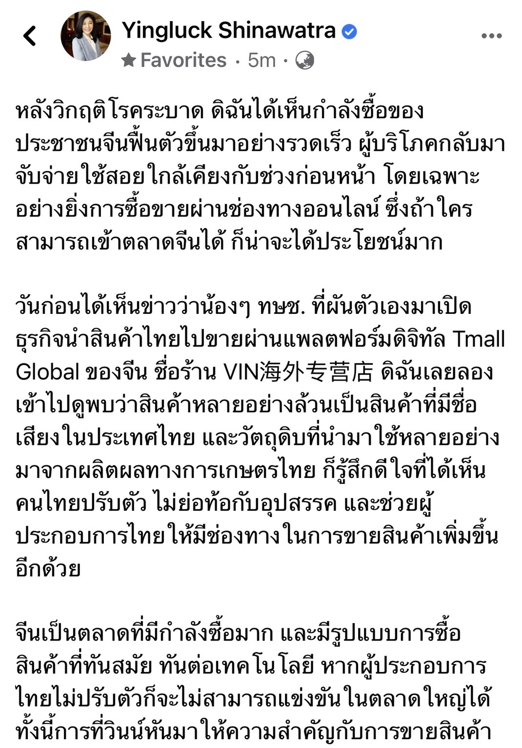 นางสาวยิ่งลักษณ์ ชินวัตร อดีตนายกรัฐมนตรี โพสต์ข้อความผ่านเฟซบุ๊ก “Yingluck Shinawatra” โดยระบุว่า หลังวิกฤติโรคระบาด ตนได้เห็นกำลังซื้อของประชาชนจีนฟื้นตัวขึ้นมาอย่างรวดเร็ว ผู้บริโภคกลับมาจับจ่ายใช้สอยใกล้เคียงกับช่วงก่อนหน้า โดยเฉพาะอย่างยิ่งการซื้อขายผ่านช่องทางออนไลน์ ซึ่งถ้าใครสามารถเข้าตลาดจีนได้ ก็น่าจะได้ประโยชน์มาก