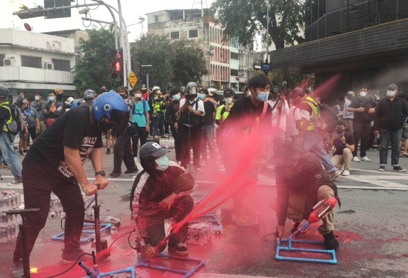 ได้เริ่มเดินขบวนมายัง บริเวณแนวกั้นของเจ้าหน้าที่ตำรวจ และได้มีการเทสีแดงลงบนพื้นถนนกลางแยกนางเลิ้ง เพื่อสื่อถึงเลือดเนื้อของประชาชนที่เสียไป จากการบริหารรัฐบาลที่ล้มเหลวของพลเอกประยุทธ์ หลังจากนั้นกลุ่มมวลชนได้เริ่มยิงจรวดขวดน้ำ ถุงสีและโปรยกระดาษที่เขียนข้อความขับไล่พลเอกประยุทธ์เข้าไปด้านในพื้นที่หลังรั้วลวดหนาม