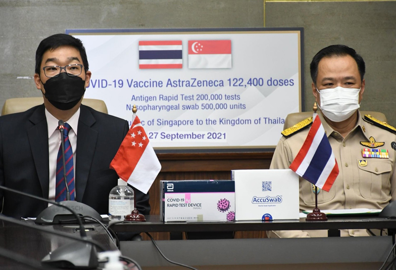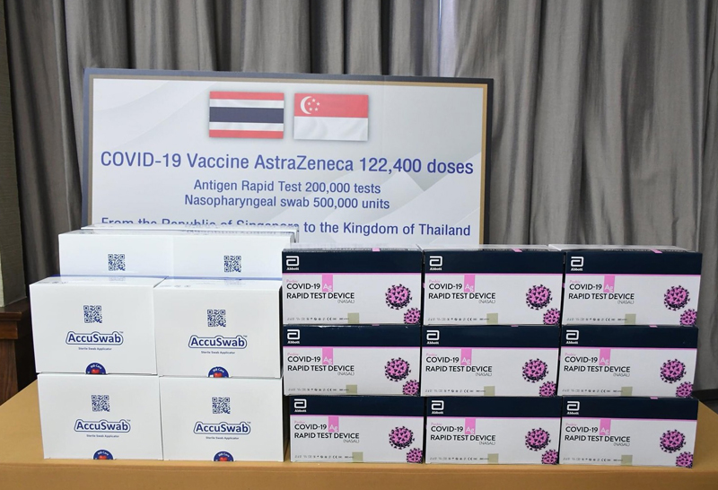 นายอนุทิน ชาญวีรกูล รองนายกรัฐมนตรีและรัฐมนตรีว่าการกระทรวงสาธารณสุข พร้อมคณะผู้บริหาร รับมอบวัคซีนแอสตร้าเซนเนก้า 122,400 โดส ชุดตรวจ Antigen Rapid Test 200,000 ชุด และชุดตรวจแบบ Nasopharyngeal Swab 500,000 ชุด จากรัฐบาลสิงคโปร์ โดยมีนายเควิน ฉ็อก (H.E. Mr. Kevin Cheok) เอกอัครราชทูตสิงคโปร์ประจำประเทศไทย และคณะ เป็นตัวแทนมอบ พร้อมด้วยนายดุสิต เมนะพันธุ์ รองปลัดกระทรวงการต่างประเทศ ร่วมเป็นสักขีพยาน