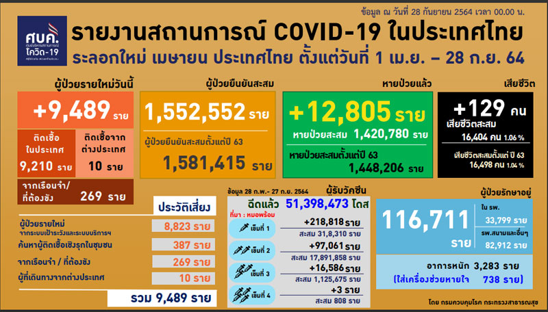 ศูนย์บริหารสถานการณ์โควิด-19 หรือ ศบค. รายงานตัวเลขสถานการณ์ประจำวันอังคารที่ 28 กันยายน 2564 ประเทศไทยอยู่ในอันดับที่ 28 ของโลกพบผู้ติดเชื้อรายใหม่รวม 9,489 ราย แบ่งเป็นผู้ป่วยรายใหม่ 9,220 ราย ผู้ป่วยในเรือนจำ 269 ราย พบผู้ป่วยยืนยันสะสมทั้งหมด 1,581,415 ราย รักษาอยู่ 116,711 ราย รักษาในโรงพยาบาล 33,799 ราย และโรงพยาบาลสนาม 82,912 ราย เป็นผู้ป่วยอาการหนัก 3,283 ราย และต้องใส่ท่อช่วยหายใจ 738 ราย รักษาหายกลับบ้านแล้ว 1,448,206 ราย หายเพิ่ม 12,805 ราย เสียชีวิตใหม่ 129 ราย รวมเสียชีวิต 16,498 คน