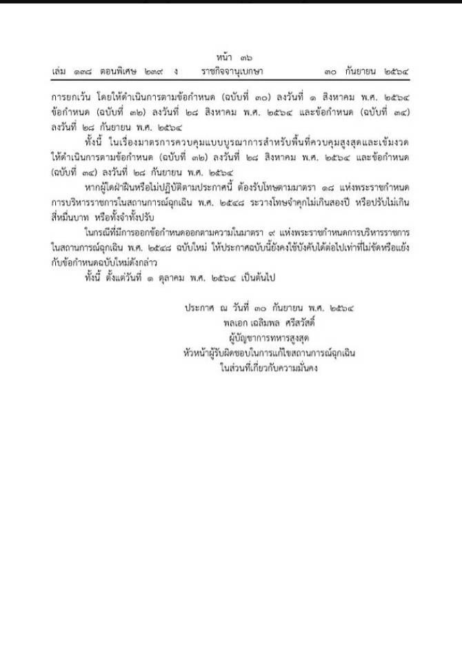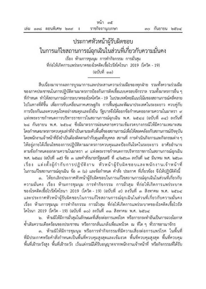 ราชกิจจานุเบกษา เผยแพร่ประกาศ ประกาศหัวหน้าผู้รับผิดชอบในการแก้ไขสถานการณ์ฉุกเฉินในส่วนที่เกี่ยวกับความมั่นคง เรื่อง ห้ามการชุมนุม การทำกิจกรรม การมั่วสุมที่ก่อให้เกิดการแพร่ระบาดของโรคติดเชื้อไวรัสโคโรนา 2019 (โควิด- 19) ฉบับที่ 11 ลงนามโดย พล.อ.เฉลิมพล ศรีสวัสดิ์ ผู้บัญชาการทหารสูงสุด และหัวหน้าผู้รับผิดชอบในการแก้ไขสถานการณ์ฉุกเฉินในส่วนที่เกี่ยวกับความมั่นคงความว่า สืบเนื่องมาจากผลการบูรณาการและประสานความร่วมมือของทุกฝ่าย รวมทั้งความร่วมมือของภาคประชาชนในการปฏิบัติตามมาตรการป้องกันการติดเชื้อแบบครอบจักรวาล รวมทั้งมาตรการอื่นๆที่กำหนด ทำให้สถานการณ์การระบาดของโรคโควิด- 19 ในประเทศไทยมีแนวโน้มของสถานการณ์คลี่คลายไปในทางที่ดีขึ้น เพื่อการขับเคลื่อนภาคเศรษฐกิจ การฟื้นฟูและพัฒนาประเทศในระยะยาว ควบคู่กับการป้องกันและควบคุมโรคอย่างสมดุลและยั่งยืน รัฐบาลจึงได้ออกข้อกำหนดออกตามความในมาตรา 9 แห่งพระราชกำหนดการบริหารราชการในสถานการณ์ฉุกเฉิน พ.ศ. 2548(ฉบับที่ 34) ลงวันที่ 28 กันยายนพ.ศ. 2564 ซึ่งมีมาตรการผ่อนคลายความเข้มงวดบางกรณีให้มีความเหมาะสมโดยกำหนดมาตรการควบคุมเท่าที่จำเป็นตามระดับพื้นที่ของสถานการณ์เพื่อให้สอดคล้องกับสถานการณ์ปัจจุบัน