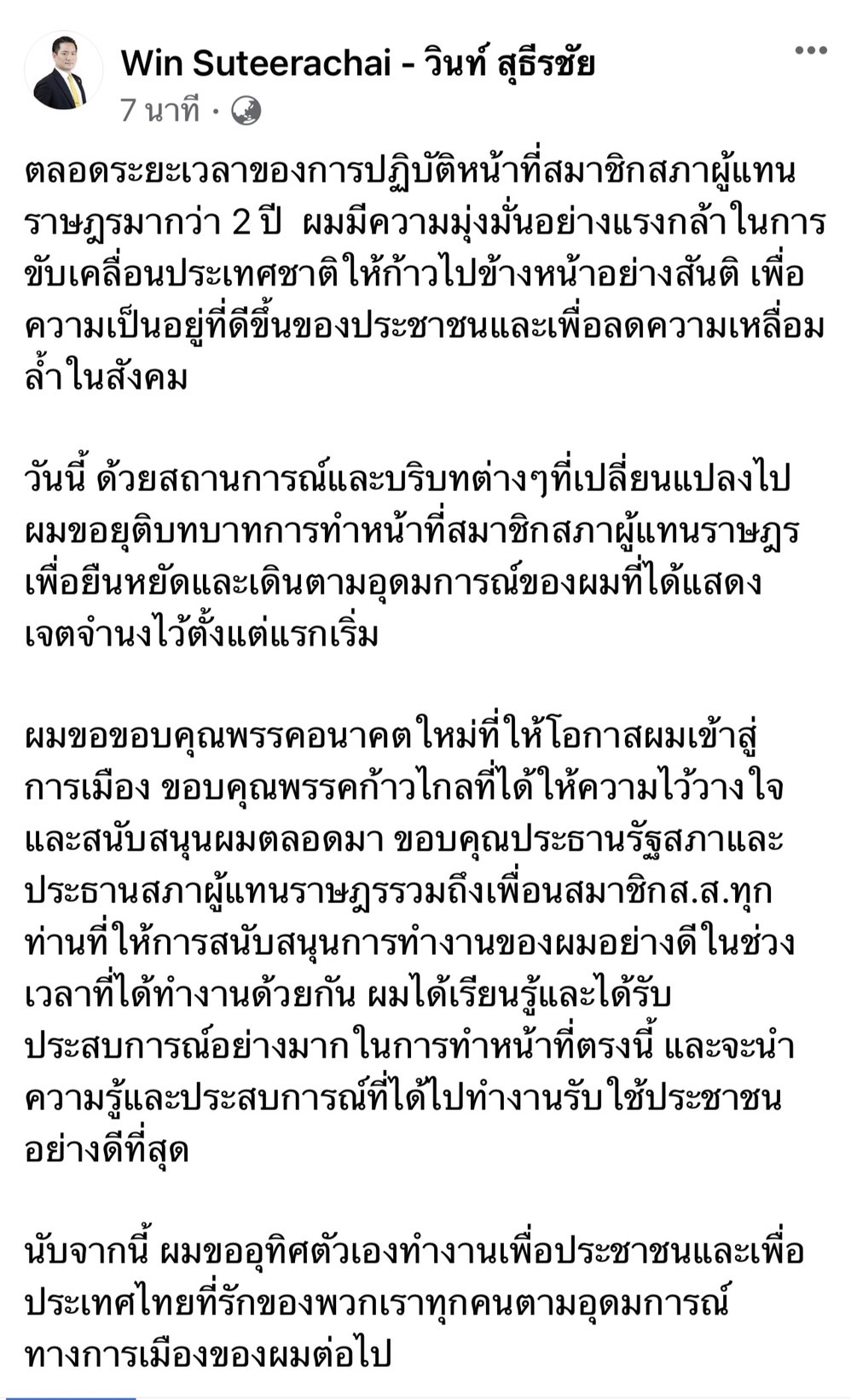 วันนี้ ด้วยสถานการณ์และบริบทต่างๆที่เปลี่ยนแปลงไป ตนขอยุติบทบาทการทำหน้าที่สมาชิกสภาผู้แทนราษฎร เพื่อยืนหยัดและเดินตามอุดมการณ์ของผมที่ได้แสดงเจตจำนงไว้ตั้งแต่แรกเริ่ม พร้อมขอขอบคุณพรรคอนาคตใหม่ที่ให้โอกาสตนเข้าสู่การเมือง ขอบคุณพรรคก้าวไกลที่ได้ให้ความไว้วางใจและสนับสนุนตนตลอดมา ขอบคุณประธานรัฐสภาและประธานสภาผู้แทนราษฎรรวมถึงเพื่อนสมาชิก ส.ส.ทุกคนที่ให้การสนับสนุนการทำงานของตนอย่างดีในช่วงเวลาที่ได้ทำงานด้วยกัน ตนได้เรียนรู้และได้รับประสบการณ์อย่างมากในการทำหน้าที่ตรงนี้ และจะนำความรู้และประสบการณ์ที่ได้ไปทำงานรับใช้ประชาชนอย่างดีที่สุด