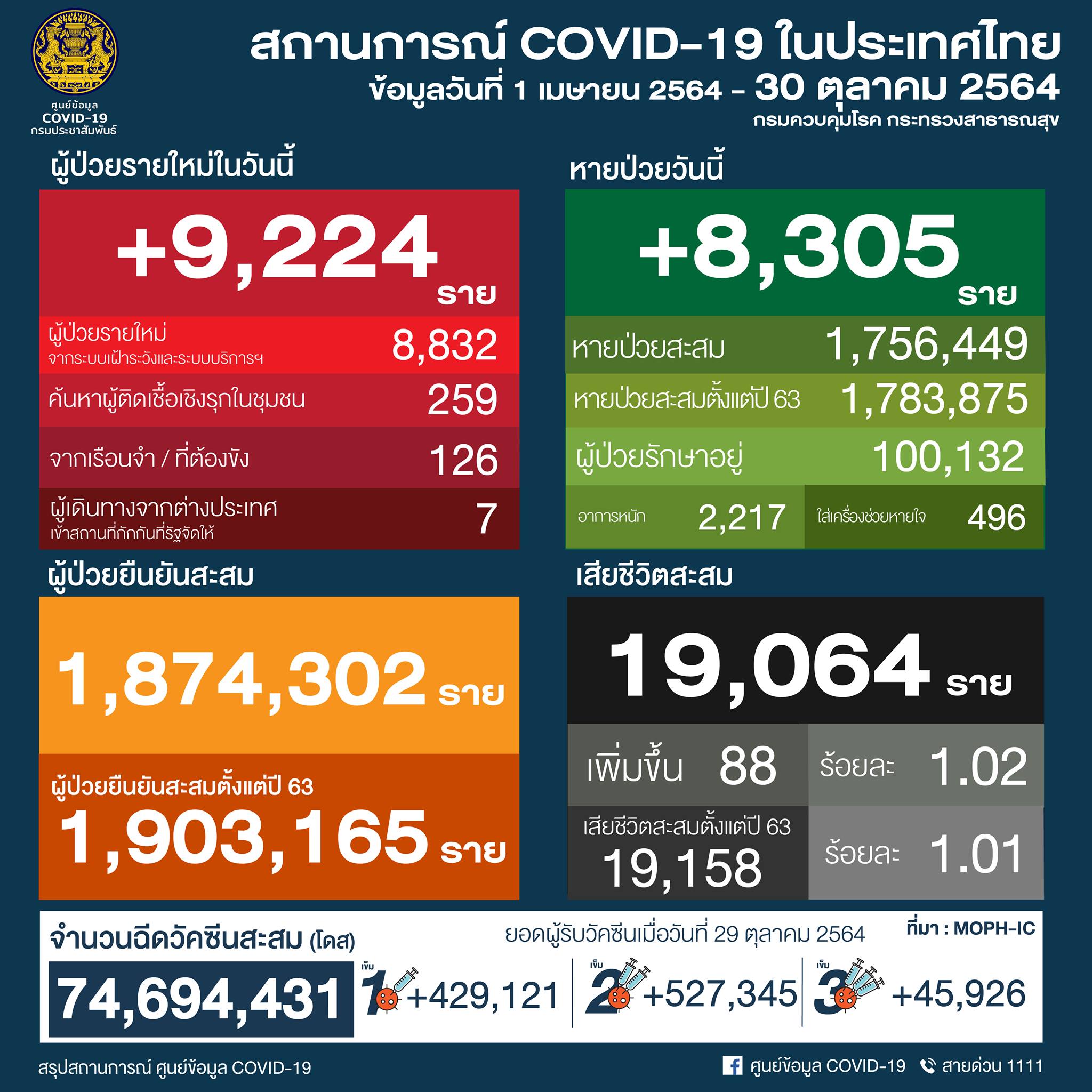 ศูนย์บริหารสถานการณ์โควิด-19 หรือศบค. รายงานตัวเลขสถานการณ์ประจำวันเสาร์ที่ 30 ตุลาคม 2564 ประเทศไทยอยู่ในอันดับที่ 24 ของโลกพบผู้ติดเชื้อรายใหม่รวม 9,224 ราย แบ่งเป็นผู้ป่วยใหม่ 9,061 ราย ติดจากเรือนจำ 126 ราย เป็นผู้ป่วยยืนยันสะสมทั้งหมด 1,903,165 รายหายป่วยแล้ว 1,783,875 ราย เหลือรักษาตัวในโรงพยาบาล 100,132 ราย ในโรงพยาบาล 45,534 ราย และโรงพยาบาลสนาม 54,598 รายเป็นผู้ป่วยอาการหนัก 2,217ราย และต้องใส่ท่อช่วยหายใจ 496ราย เสียชีวิตใหม่ 88 ราย รวมเสียชีวิต 19,158 ราย
