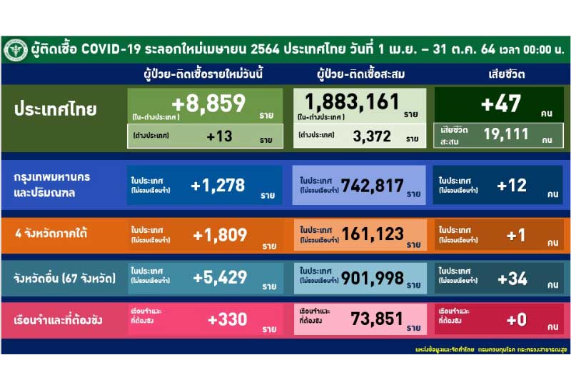ศูนย์บริหารสถานการณ์โควิด-19 หรือศบค. รายงานตัวเลขสถานการณ์ประจำวันอาทิตย์ที่ 31 ตุลาคม 2564 ประเทศไทยอยู่ในอันดับที่ 24 ของโลก พบผู้ติดเชื้อราย ใหม่รวม 8,859 ราย แบ่งเป็นผู้ป่วยใหม่ 8,529 ราย ติดจากเรือนจำ 330 ราย เป็นผู้ป่วยยืนยันสะสมทั้งหมด 1,912,024 ราย รักษาอยู่ 100,691 ราย รักษาในโรงพยาบาล 45,634 ราย และโรงพยาบาลสนาม 55,057 ราย เป็นผู้ป่วยอาการหนัก 2,225 ราย และต้องใส่ท่อช่วยหายใจ 500 ราย รักษาหายกลับบ้านแล้ว 1,792,128 ราย หายเพิ่ม 8,253 ราย เสียชีวิตใหม่ 47 ราย รวมเสียชีวิต 19,205 คน