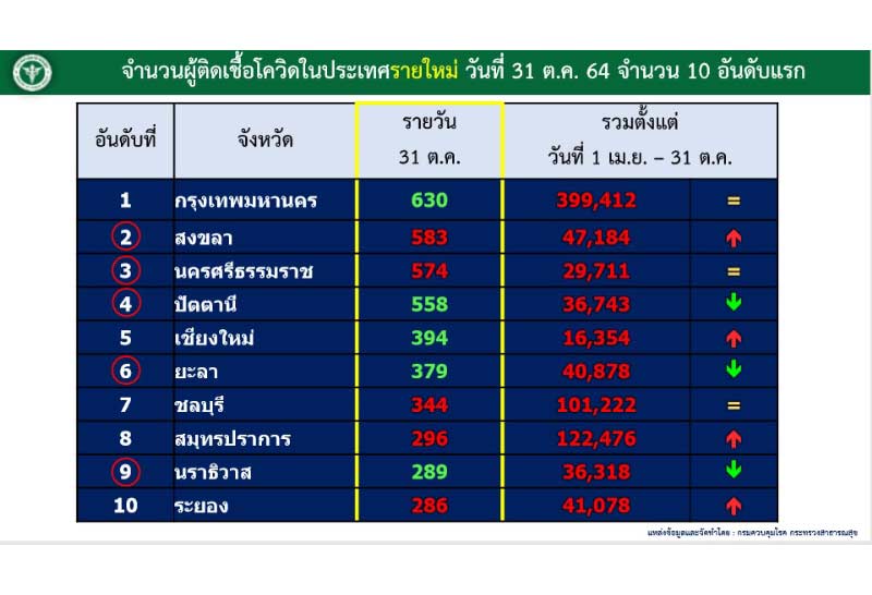 จำนวนผู้ติดเชื้อโควิดในประเทศรายใหม่ 10 อันดับแรก แบ่งเป็น กรุงเทพมหานคร 630 ราย รวมสะสม 399,412 ราย, สงขลา 583 ราย รวมสะสม 41,184 ราย , นครศรีธรรมราช 547 ราย รวมสะสม 29,711 ราย, ปัตตานี 558 รายรวมสะสม 36,743 ราย, เชียงใหม่ 394 ราย รวมสะสม 16,354 ราย, ยะลา 379 ราย รวมสะสม 40,878 ราย, ชลบุรี 344 ราย รวมสะสม 101,222 ราย, สมุทรปราการ 296 ราย รวมสะสม 122,476 ราย, นราธิวาส 289 ราย รวมสะสม 36,318 ราย และระยอง 286 รายรวมสะสม 41,078 ราย