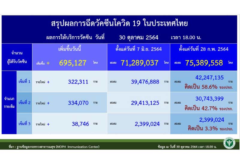 ด้านยอดการฉีดวัคซีนในประเทศไทยรวม 75,389,558 โดส สะสมแบ่งเป็นฉีดวัคซีนเข็มแรก 42,247,135 ราย เพิ่มขึ้น 322,311 ราย เข็มที่สองจำนวน 30,743,339 ราย เพิ่มขึ้น 334,070 ราย และเข็มที่สามสะสมจำนวน 2,399,024 ราย เพิ่มขึ้น 38,746 ราย