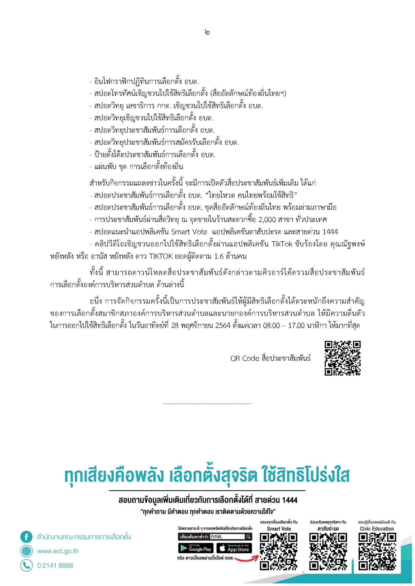 สำนักงานคณะกรรมการการเลือกตั้ง ได้จัดกิจกรรมประชาสัมพันธ์การเลือกตั้งสมาชิกสภาองค์การบริหารส่วนตำบลและนายกองค์การบริหารส่วนตำบล ในวันอาทิตย์ที่ 28 พฤศจิกายน 2564 ภายใต้คำขวัญ “ไทยโหวต คนไทยพร้อมใช้สิทธิ” ซึ่งเป็นกิจกรรมเปิดตัวแคมเปญรณรงค์คนไทยเตรียมพร้อมออกไปใช้สิทธิ และการเปิดตัวสื่อประชาสัมพันธ์การเลือกตั้งสมาชิกสภาองค์การบริหารส่วนตำบลและนายกองค์การบริหารส่วนตำบล โดยมี นายฐิติเชฏฐ์ นุชนาฏ กรรมการการเลือกตั้ง เป็นประธานในพิธีเปิด พร้อมด้วย พ.ต.อ.จรุงวิทย์ ภุมมา เลขาธิการคณะกรรมการการเลือกตั้ง ผู้บริหารและพนักงานของสำนักงานคณะกรรมการการเลือกตั้ง