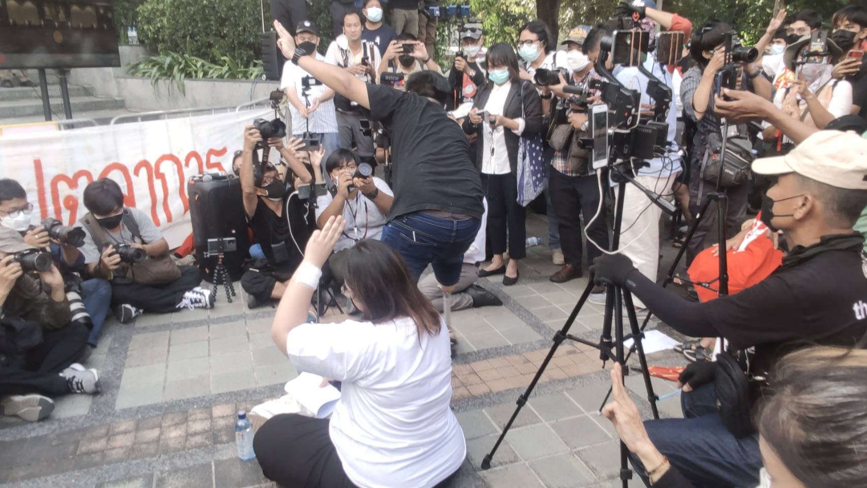 บรรยากาศภายนอกศาลรัฐธรรมนูญในขณะที่ศาลรัฐธรรมนูญยังอ่านคำวินิจฉัยคดีที่นายณฐพร โตประยูร (ผู้ร้อง) ขอให้ศาลรัฐธรรมนูญวินิจฉัย ว่า การกระทำของนายอานนท์ นำภา นายภาณุพงศ์ จาดนอก นางสาวปนัสยา สิทธิจิรวัฒนกุลในการชุมนุมปราศรัยเพื่อเสนอข้อเรียกร้องเป็นการใช้สิทธิหรือเสรีภาพ เพื่อล้มล้างการปกครองระบอบประชาธิปไตยอันมีพระมหากษัตริย์ทรงเป็นประมุขตามรัฐธรรมนูญ มาตรา 49 วรรคหนึ่ง หรือไม่ ซึ่งในเวลา15.30 น. น.ส.ปนัสยา ได้เดินออกมาจากห้องการวินิจฉัย เนื่องจากศาลไม่อนุญาตให้มีการไต่สวนเพิ่มเติม ตามที่ผู้ถูกร้องร้องขอ และออกมานั่งฟังการวินิจฉัยอยู่ด้านนอกพร้อมกับมวลชนที่มาร่วมให้กำลังใจ