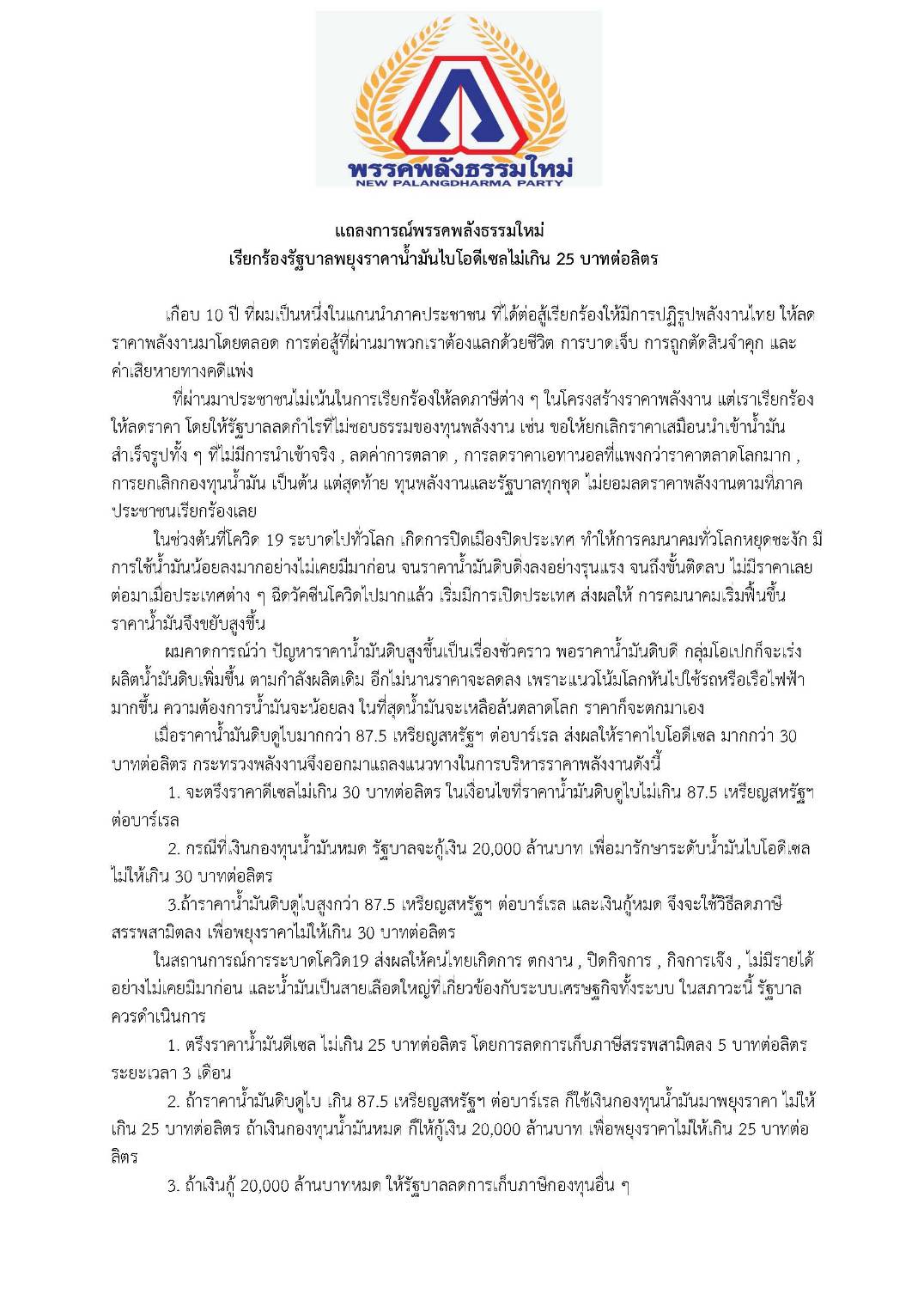 อย่างไรก็ตาม ในสถานการณ์การระบาดโควิด19 ส่งผลให้คนไทยเกิดการ ตกงาน ปิดกิจการ กิจการเจ๊ง ไม่มีรายได้ อย่างไม่เคยมีมาก่อน และน้ำมันเป็นสายเลือดใหญ่ที่เกี่ยวข้องกับระบบเศรษฐกิจทั้งระบบ ในสภาวะนี้ รัฐบาลควรดำเนินการคือ ตรึงราคาน้ำมันดีเซล ไม่เกิน 25 บาทต่อลิตร โดยการลดการเก็บภาษีสรรพสามิตลง 5 บาทต่อลิตร ระยะเวลา 3 เดือน และถ้าราคาน้ำมันดิบดูไบ เกิน 87.5 เหรียญสหรัฐฯ ต่อบาร์เรล ก็ใช้เงินกองทุนน้ำมันมาพยุงราคา ไม่ให้เกิน 25 บาทต่อลิตร ถ้าเงินกองทุนน้ำมันหมด ก็ให้กู้เงิน 20,000 ล้านบาท เพื่อพยุงราคาไม่ให้เกิน 25 บาทต่อลิตร นอกจากนี้หากเงินกู้ 20,000 ล้านบาทหมด ให้รัฐบาลลดการเก็บภาษีกองทุนอื่น ๆ