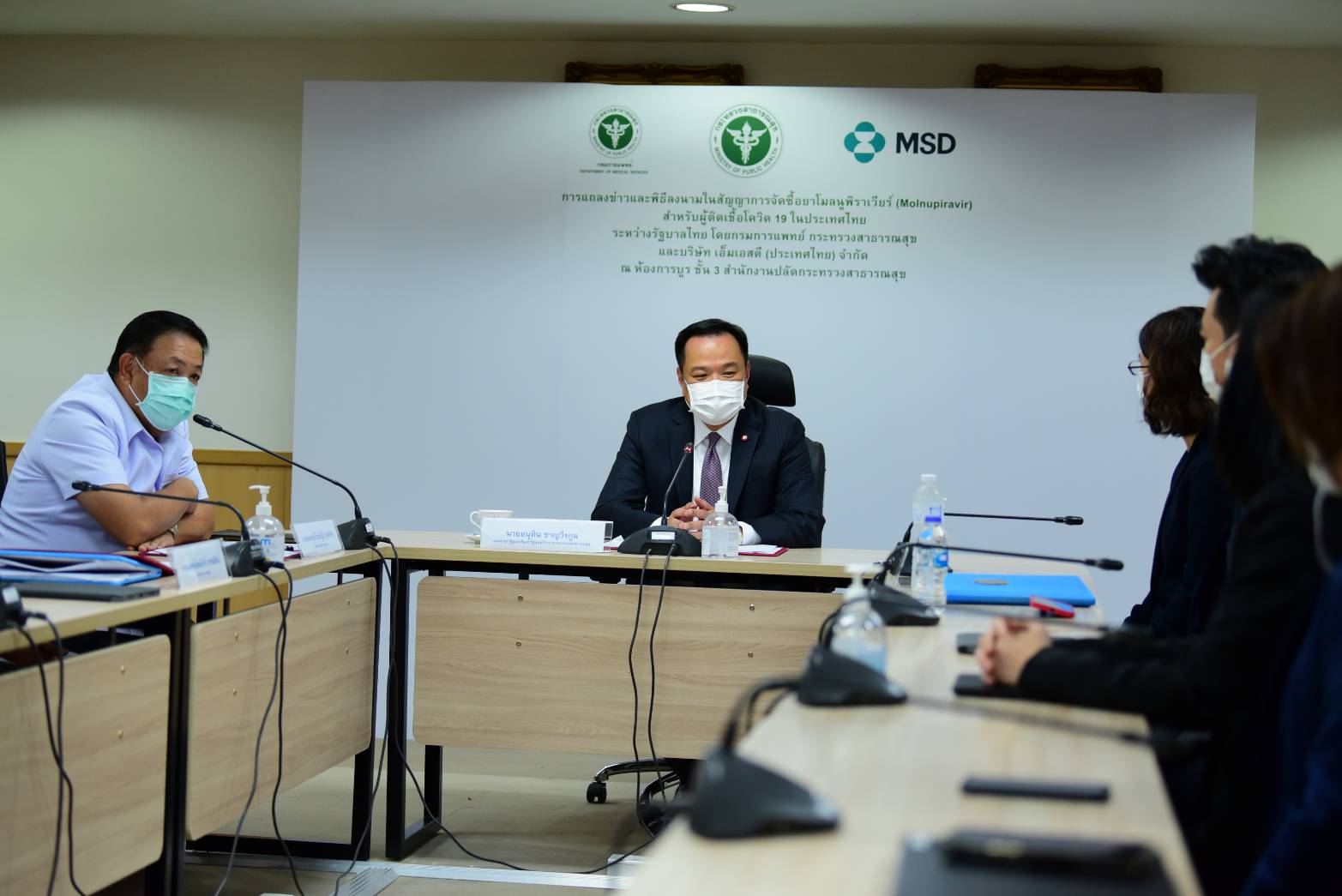 จากนั้น นายอนุทิน ได้กล่าวถึงยอดการให้บริการวัคซีนภาพรวม ระบุว่า สิ้นเดือนพฤศจิกายน 2564 เราจะให้บริการไปถึงตัวเลข 100 ล้านโดส เท่ากับผู้มีสิทธิ์ได้รับวัคซีน 47 ล้านคน ได้รับการฉีดแล้ว จะเหลืออีกประมาณ 3 ล้านคน ที่ต้องเร่งเก็บให้หมด ในปีหน้าประเทศไทย จะมีวัคซีนไฟเซอร์เข้ามาอีก 30 ล้านโดส และมีวัคซีนแอสตร้าเซนเนก้าอีก 60 ล้านโดส เป็นเข็มบูสเตอร์ เราน่าจะมีวัคซีนเพียงพอกับความต้องการแล้ว แต่ก็ไม่ลืมที่จะหาข้อมูล และปรับเปลี่ยนแผนการอยู่ตลอด เพื่อให้ทันกับสถานการณ์ ส่วนในเรื่องของยานั้น ล่าสุด บรรลุสัญญา ซื้อยาโมลนูพิราเวียร์ไปแล้ว 5 หมื่นคอร์ส ประมาณ 2 ล้านเม็ด จะเป็นอีกหนึ่งทางเลือกสำหรับการรักษาพยาบาล หลังจากที่เรามียาอย่างฟาวิพิราเวียร์อยู่ ขณะนี้ กำลังเสนอจัดหายา “แพกซ์โลวิด” เข้ามาด้วย เพื่อสร้างความมั่นคงด้านยาและเวชภัณฑ์