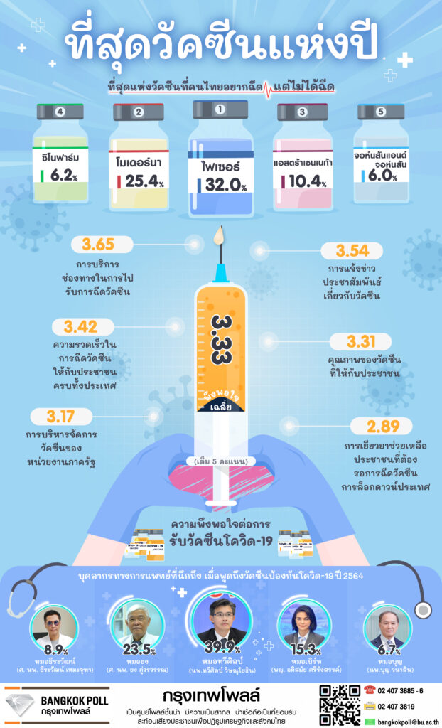 “กรุงเทพโพลล์” มหาวิทยาลัยกรุงเทพ เปิดเผยผลสำรวจความคิดเห็นประชาชนเรื่อง “ที่สุดวัคซีนแห่งปี” เนื่องในโอกาส “วันที่ 27 พฤศจิกายน ของทุกปี” เป็นวันสาธารณสุขแห่งชาติโดยเก็บข้อมูลจากประชาชนทั่วประเทศ จำนวน 1,172 คน โดยการสุ่มสัมภาษณ์ทางโทรศัพท์ ระหว่างวันที่ 22-24 พ.ย.ที่ผ่านมา พบว่า ประชาชน ร้อยละ 32.0 อยากฉีดวัคซีนโควิด – 19 ของไฟเซอร์มากที่สุด รองลงมา ร้อยละ 25.4 โมเดอร์นา และร้อยละ 10.4 แอสตร้าเซนเนก้า,ร้อยละ 6.2 ซิโนฟาร์ม, ร้อยละ 6.0 จอห์นสันแอนด์จอห์นสัน และ ร้อยละ 1.1 ชิโนแวค