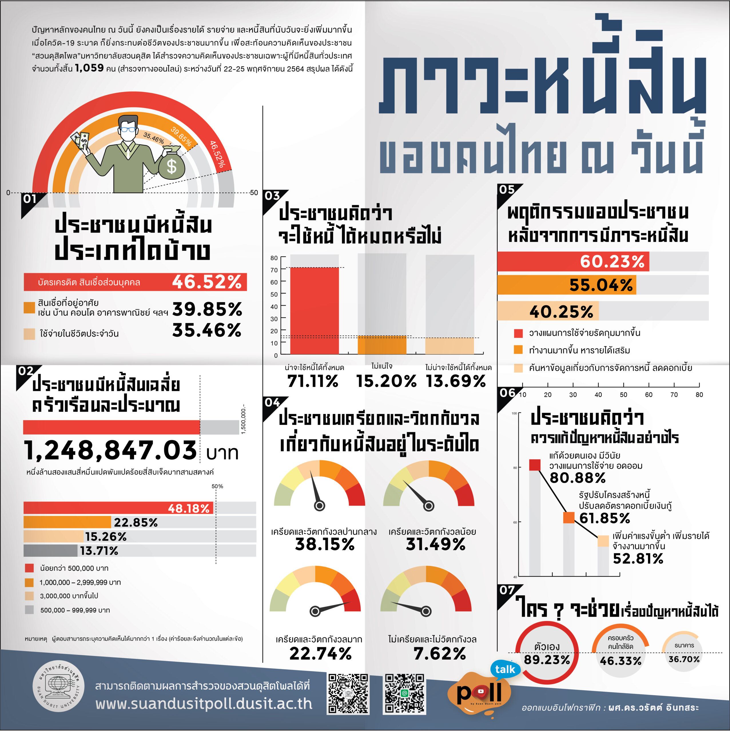 “สวนดุสิตโพล”มหาวิทยาลัยสวนดุสิต ได้สำรวจความคิดเห็นของประชาชนเฉพาะผู้ที่มีหนี้สินทั่วประเทศ จำนวนทั้งสิ้น 1,059 คน เรื่อง ภาวะหนี้สินของคนไทย ณ วันนี้เมื่อถามถึงหนี้สินของประชาชน พบว่า ร้อยละ 46.52 ระบุ บัตรเครดิต สินเชื่อส่วนบุคคล รองลงมา ร้อยละ 39.85 ระบุ สินเชื่อที่อยู่อาศัย เช่น บ้าน คอนโด อาคารพาณิชย์ ฯลฯร้อยละ 30.79 ระบุ ใช้จ่ายในชีวิตประจำวัน