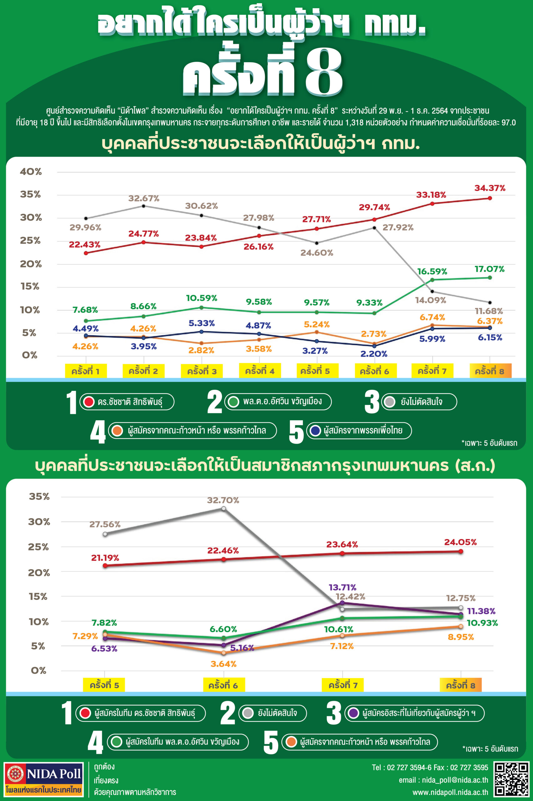 ศูนย์สำรวจความคิดเห็น “นิด้าโพล” สถาบันบัณฑิตพัฒนบริหารศาสตร์ (นิด้า) เปิดเผยผลสำรวจของประชาชน เรื่อง “อยากได้ใครเป็นผู้ว่าฯ กทม. ครั้งที่ 8” ทำการสำรวจระหว่างวันที่ 29 พ.ย. – 1 ธ.ค.ที่ผ่านมา จากประชาชนที่มีอายุ 18 ปีขึ้นไป และมีสิทธิเลือกตั้งในกรุงเทพมหานคร กระจายทุกระดับการศึกษาอาชีพ และรายได้ รวมทั้งสิ้น 1,318 หน่วยตัวอย่าง โดยเก็บข้อมูลด้วยวิธีการสัมภาษณ์ทางโทรศัพท์ ซึ่งจากการสำรวจครั้งที่ 8 นี้ บุคคลที่ประชาชนจะเลือกให้เป็นผู้ว่าฯกทม.