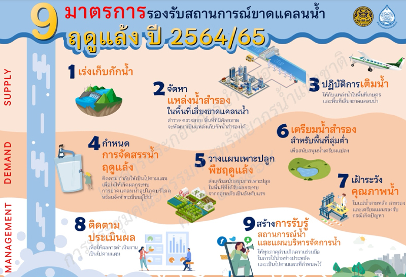 จากนั้น ที่ประชุมได้พิจารณาเห็นชอบ 9 มาตรการ รองรับสถานการณ์ขาดแคลนน้ำฤดูแล้งปี 64/65 ซึ่งประกอบด้วย มาตรการที่
