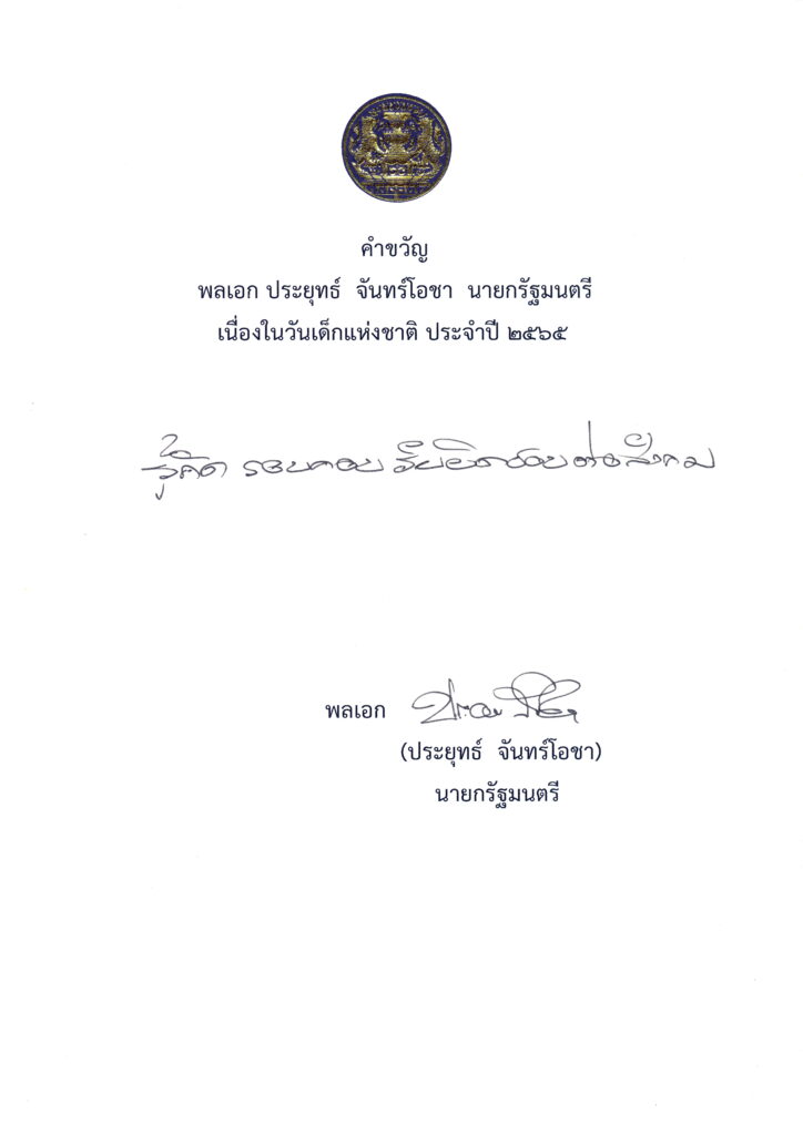 พล.อ.ประยุทธ์ จันทร์โอชา นายกรัฐมนตรีและรัฐมนตรีว่าการกระทรวงกลาโหม ได้มอบคำขวัญเนื่องในวันเด็กแห่งชาติ ประจำปี 2565 ซึ่งตรงกับวันที่ 8 มกราคม 2565 ให้กับเด็กๆ เยาวชนไทย เพื่อเป็นข้อคิดคติเตือนใจ กับอนาคตของชาติ ว่า