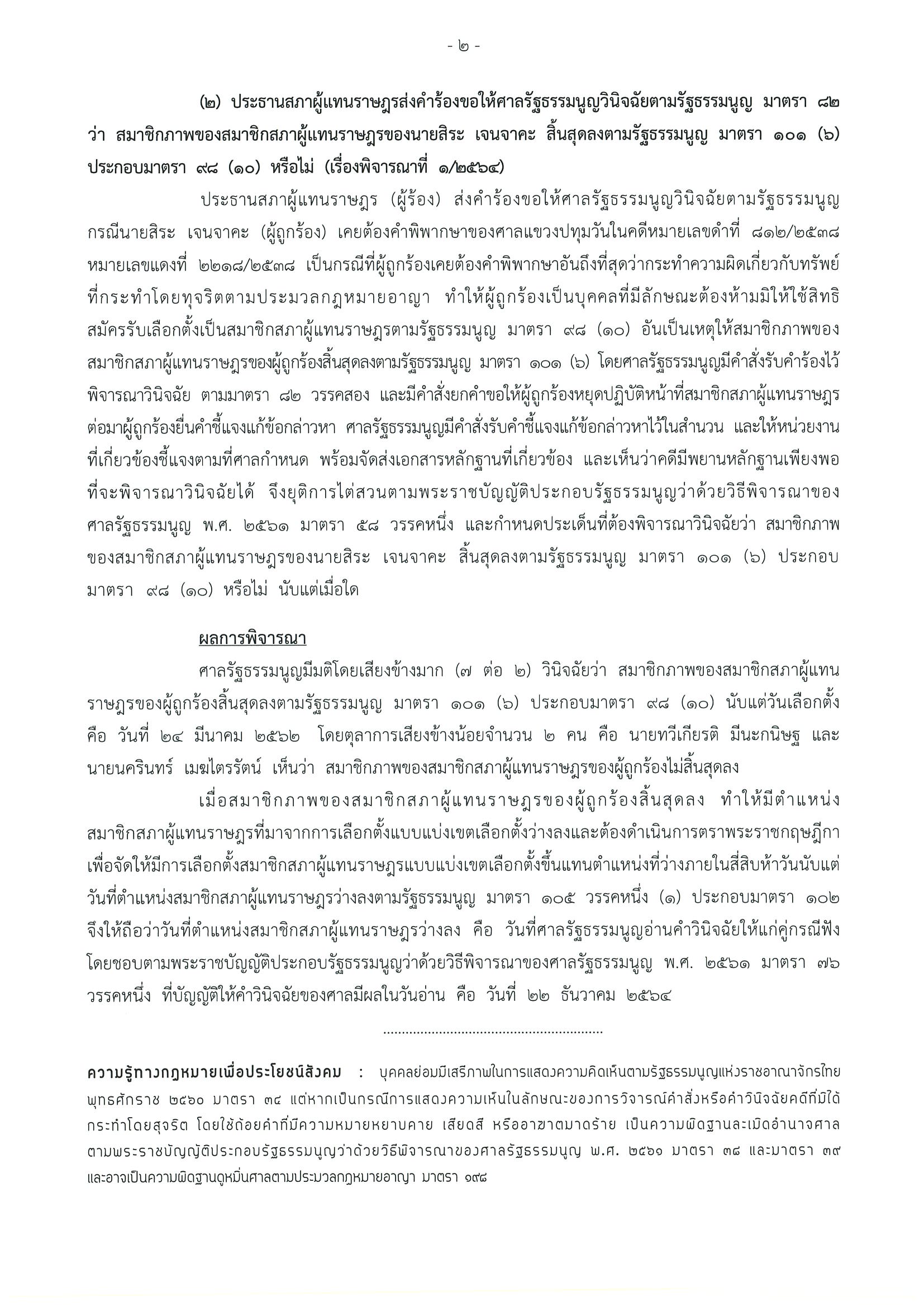 ซึ่งจากพยานหลักฐานสรุปได้ว่านายสิระเคยต้องคำพิพากษาจริง จึงเป็นบุคคลที่มีลักษณะต้องห้ามสมัครเลือกตั้งเป็นผู้แทนราษฎร เป็นเหตุให้สมาชิกสภาพสิ้นสุดลงตามรัฐธรรมนูญ โดยสิ้นสุดลงนับตั้งแต่วันเลือกตั้งสมาชิกสภาผู้แทนราษฎร คือวันที่ 24 มีนาคม 2562 ดังนั้นจึงมีตำแหน่ง สมาชิกสภาผู้แทนราษฎรแบบแบ่งเขตเลือกตั้งว่างลง คณะกรรมการการเลือกตั้ง จึงจะจัดให้มีการเลือกตั้งภายใน45วัน นับแต่วันที่ศาลอ่านคำวินิจฉัย คือวันที่22 ธันวาคม 2564