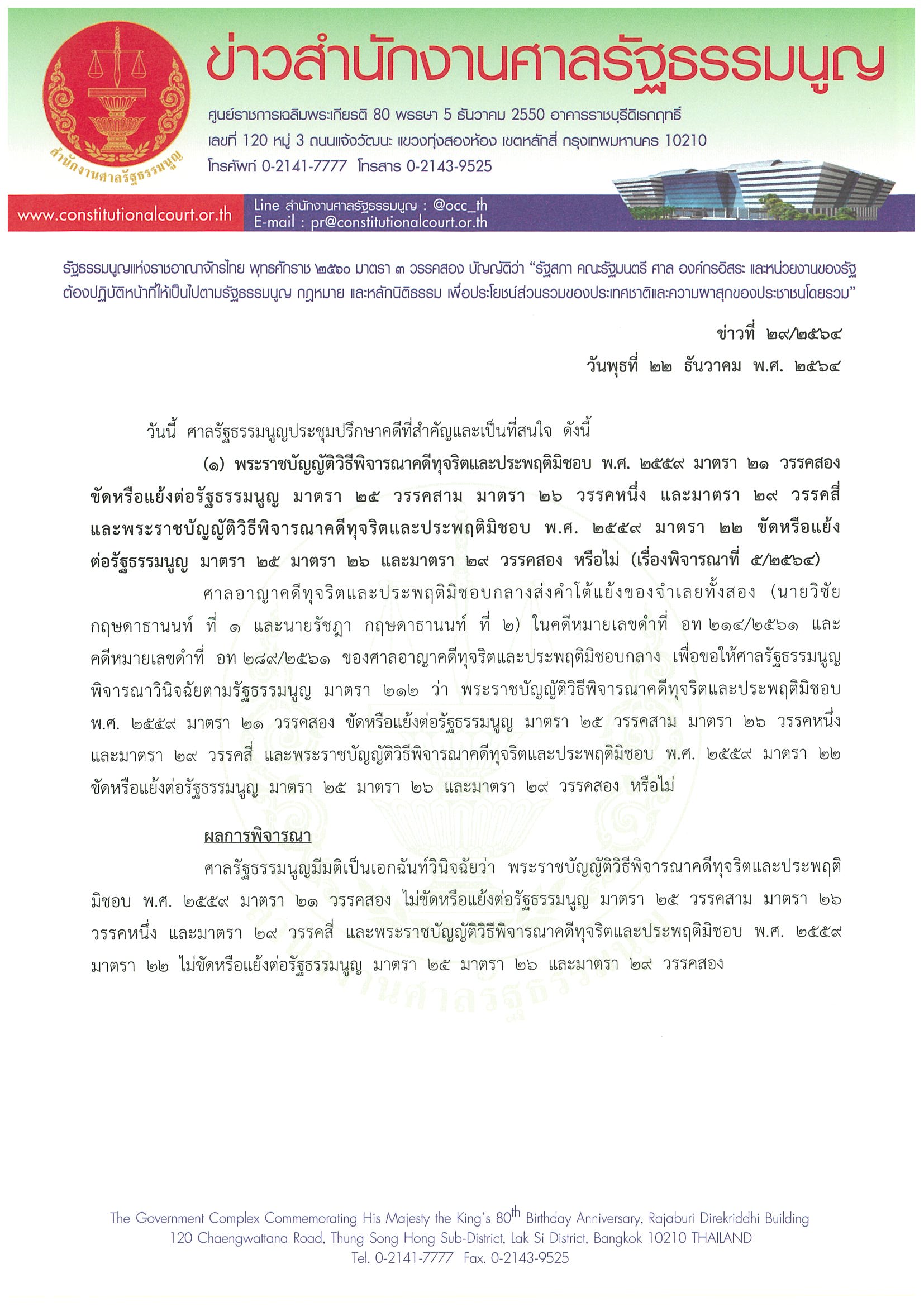 ศาลรัฐธรรมนูญนัดวินิจฉัยและอ่านคำวินิจฉัยคำร้องของประธานสภาผู้แทนราษฎร กรณีที่นายสิระ เจนจาคะ ส.ส. กทม. พรรคพลังประชารัฐ มีลักษณะต้องห้ามมิให้ใช้สิทธิสมัครรับเลือกตั้งตามรัฐธรรมนูญ มาตรา 98 (10) เป็นเหตุให้สมาชิกภาพ ส.ส.สิ้นสุดลงตามรัฐธรรมนูญ มาตรา 101 (6) หรือไม่ เนื่องจากเคยต้องคำพิพากษาอันถึงที่สุดของศาลแขวงปทุมวัน ในคดีหมายเลขดำที่ 812/2538 คดีหมายเลขแดงที่ 2218/2538 กระทำความผิดเกี่ยวกับทรัพย์ที่กระทำโดยทุจริตตามประมวลกฎหมายอาญา