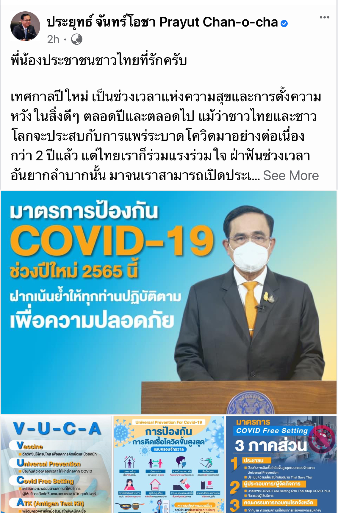 พล.อ.ประยุทธ์ จันทร์โอชา นายกรัฐมนตรีและรัฐมนตรีว่าการกระทรวงกลาโหม โพสต์เฟซบุ๊ก โดยระบุว่า พี่น้องประชาชนชาวไทยที่รักครับ เทศกาลปีใหม่ เป็นช่วงเวลาแห่งความสุขและการตั้งความหวังในสิ่งดีๆ ตลอดปีและตลอดไป แม้ว่าชาวไทยและชาวโลกจะประสบกับการแพร่ระบาดโควิดมาอย่างต่อเนื่องกว่า 2 ปีแล้ว แต่ไทยเราก็ร่วมแรงร่วมใจ ฝ่าฟันช่วงเวลาอันยากลำบากนั้น มาจนเราสามารถเปิดประเทศ เปิดกิจการ และต้อนรับนักท่องเที่ยวต่างชาติได้อีกครั้ง ซึ่งมาจากความอดทน ทุ่มเท เสียสละของทุกคน ทั้งบุคลากรทางการแพทย์ เจ้าหน้าที่ด่านหน้า รวมถึงประชาชนทุกคน ที่ให้ความร่วมมือกับมาตรการของรัฐ ทุกวันนี้ผมดีใจที่ยังเห็นประชาชนส่วนใหญ่ ใส่หน้ากากอนามัยกันในสถานที่ต่างๆโดยที่เราไม่จำเป็นต้องออกกฎหมายบังคับเหมือนบางประเทศ หน้ากากอนามัยกลายเป็นอุปกรณ์สำคัญที่คนไทยไม่ลืมที่จะใส่เมื่อออกจากบ้าน ซึ่งเป็นปัจจัยสำคัญอย่างยิ่งที่ทำให้เราสามารถควบคุมสถานการณ์ได้สำเร็จ ผมต้องขอขอบคุณทุกๆ ท่านมา ณ ที่นี้