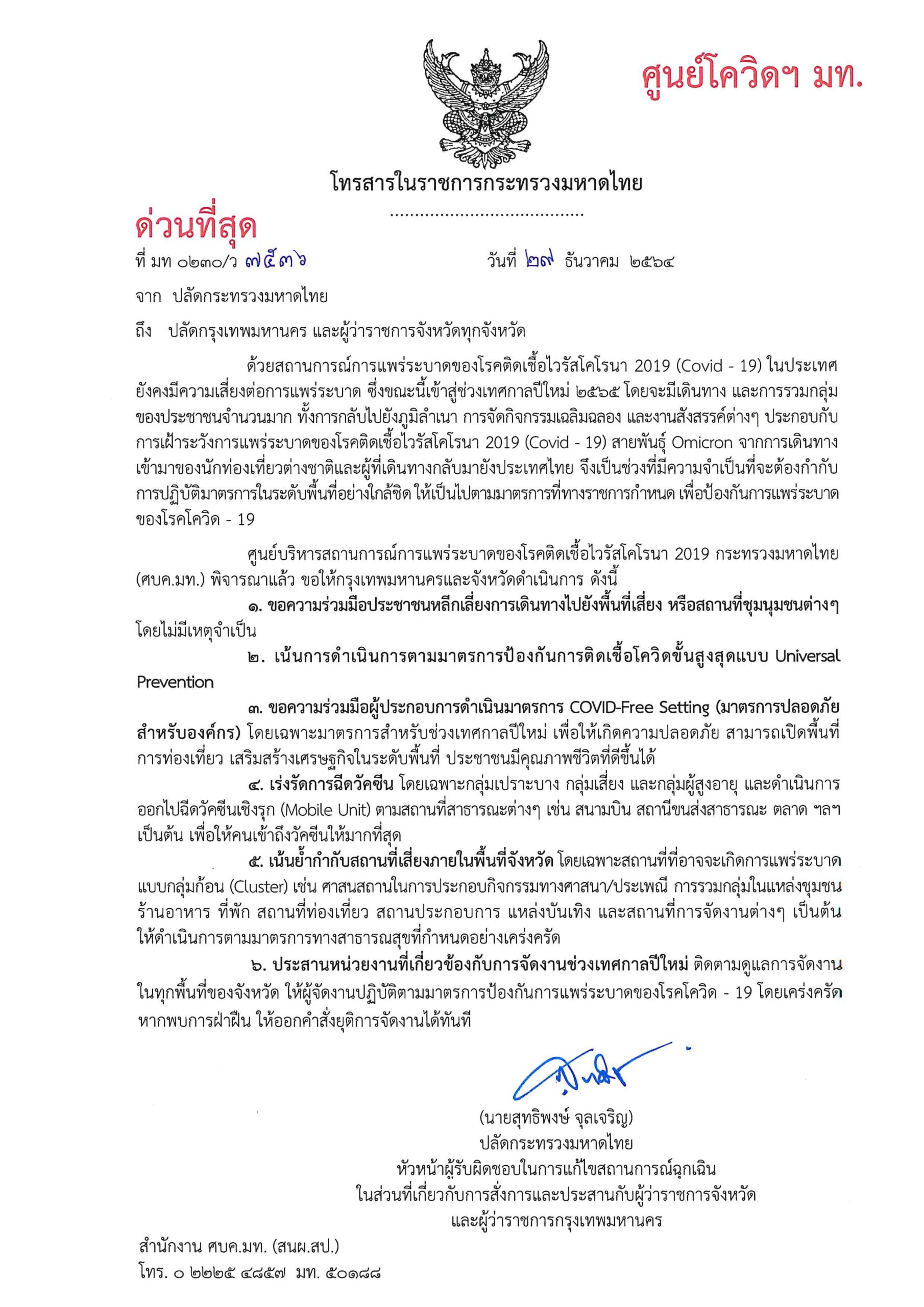 ทั้งนี้ ได้กำชับให้กรุงเทพมหานครและผู้ว่าราชการจังหวัดทุกจังหวัดดำเนินมาตรการอย่างเข้มงวด และติดตามตรวจสอบการจัดงานเทศกาลปีใหม่ในทุกพื้นที่ให้ปฏิบัติตามมาตรการอย่างเคร่งครัด หากพบการฝ่าฝืนให้ดำเนินการยุติการจัดงานโดยทันที เพื่อความปลอดภัยอย่างสูงสุดของพี่น้องประชาชน