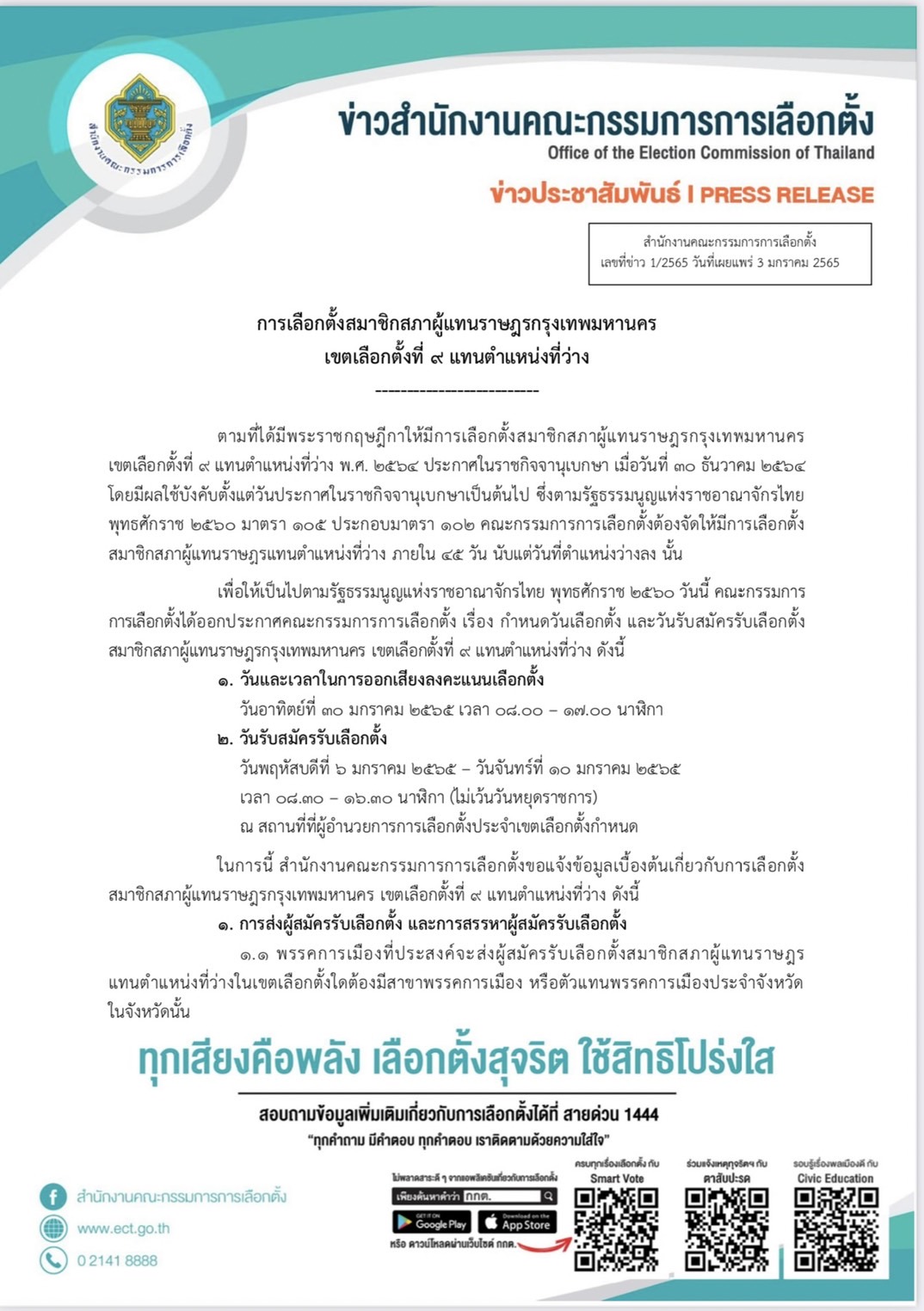 สำนักงานคณะกรรมการการเลือกตั้ง กำหนดวันเลือกตั้งสมาชิกสภาผู้แทนราษฎรกรุงเทพมหานคร เขตเลือกตั้งที่ 9 หลักสี่-จตุจักร แทนตำแหน่งที่ว่างในวันอาทิตย์ที่ 30 ม.ค.65 เปิดรับสมัครวันที่ 6-10 ม.ค.65 ตามที่ได้มีพระราชกฤษฎีกาให้มีการเลือกตั้งสมาชิกสภาผู้แทนราษฎรกรุงเทพมหานครเขตเลือกตั้งที่ 9 หลักสี่-จตุจักร แทนตำแหน่งที่ว่าง 2564 ประกาศในราชกิจจานุเบกษา เมื่อวันที่ 30 ธ.ค.64 โดยมีผลใช้บังคับตั้งแต่วันประกาศในราชกิจจานุเบกษาเป็นต้นไป ซึ่งตามรัฐธรรมนูญ60 มาตรา 105 ประกอบมาตรา 102 กกต.ต้องจัดให้มีการเลือกตั้งส.ส.แทนตำแหน่งที่ว่างภายใน 45 วัน นับแต่วันที่ตำแหน่งว่างลงนั้น เพื่อให้เป็นไปตามรัฐธรรมนูญ 60