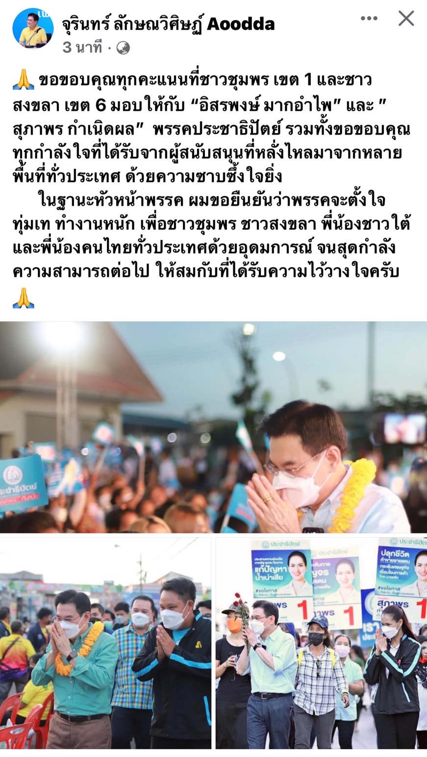 ในฐานะหัวหน้าพรรค ขอยืนยันว่าพรรคจะตั้งใจ ทุ่มเท ทำงานหนัก เพื่อชาวชุมพร ชาวสงขลา พี่น้องชาวใต้และพี่น้องคนไทยทั่วประเทศด้วยอุดมการณ์ จนสุดกำลังความสามารถต่อไป ให้สมกับที่ได้รับความไว้วางใจ