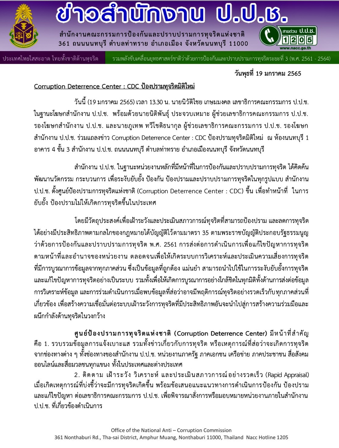 นายนิวัติไชย เกษมมงคล เลขาธิการคณะกรรมการ ป้องกันและปราบปรามการทุจริตแห่งชาติ (ป.ป.ช.)ในฐานะโฆษกสำนักงาน ป.ป.ช. พร้อมด้วยนายนิติพันธุ์ ประจวบเหมาะ ผู้ช่วยเลขาธิการคณะกรรมการ ป.ป.ช. รองโฆษกสำนักงาน ป.ป.ช. และนายภูเทพ ทวีโชติธนากุล ผู้ช่วยเลขาธิการคณะกรรมการ ป.ป.ช. รองโฆษกสำนักงาน ป.ป.ช. ร่วมแถลงข่าว ตั้งศูนย์ป้องปรามการทุจริตแห่งชาติ (Coruption Deterrence Center : CDC) ป้องปรามทุจริตมิติใหม่ เพื่อทำหน้าที่ ในการยับยั้ง ป้องปรามไม่ให้เกิดการทุจริตขึ้นในประเทศ