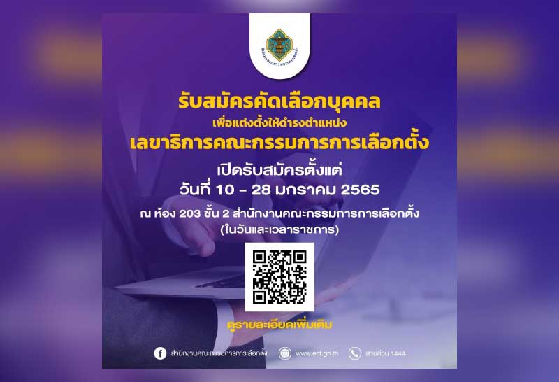 สำนักงานคณะกรรมการการเลือกตั้ง เปิดรับสมัครคัดเลือกบุคคลเพื่อแต่งตั้งให้ดำรงตำแหน่งเลขาธิการ คณะกรรมการการเลือกตั้ง แทน พ.ต.อ.จรุงวิทย์ ภุมมา อดีตเลขาธิการคณะกรรมการการเลือกตั้งซึ่งได้ลาออกจากตำแหน่ง โดยเปิดรับสมัคร ระหว่างวันที่ 10 – 28 มกราคม 2565 ณ สำนักงานคณะกรรมการการเลือกตั้ง อาคารรัฐประศาสนภักดี ศูนย์ราชการฯ ถนนแจ้งวัฒนะ