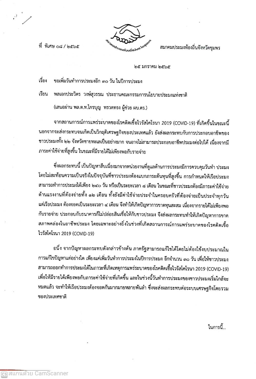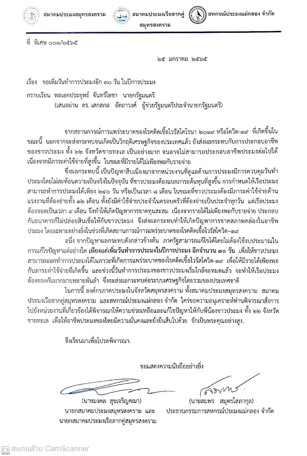 นอกจากนี้ ที่บริเวณเกาะกลาง ตรงข้ามประตู 5 ทำเนียบรัฐบาล มีกลุ่มสมาคมประมงปากน้ำชุมพรและแนวร่วม จำนวน 120 คน นำโดยนายมงคล สุขเจริญคณา นายกสมาคมประมงสมุทรสงครามและนายกสมาคมประมงเรือลากคู่สมุทรสงคราม เพื่อยื่นหนังสือถึง พล.อ.ประยุทธ์ จันทร์โอชา นายกรัฐมนตรีและรัฐมนตรีว่าการกระทรวงกลาโหม และพล.อ.ประวิตร วงษ์สุวรรณ รองนายกรัฐมนตรี ในการคัดค้านกรณีกรมสรรพสามิตจะออกประกาศบังคับให้เรือประมงต้องติดระบบ AIS ที่ เรือประมง เมื่อไปลงน้ำมันเขียว เนื่องจากเห็นว่าเป็นการเพิ่มภาระโดยไม่จำเป็นให้กับชาวประมง และขอเพิ่มวันทำการประมงอีก 30 วัน ในปีทำการประมง