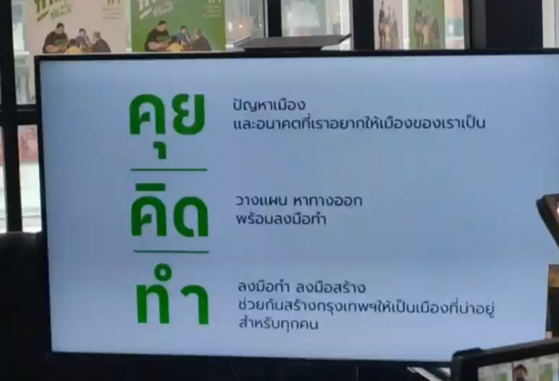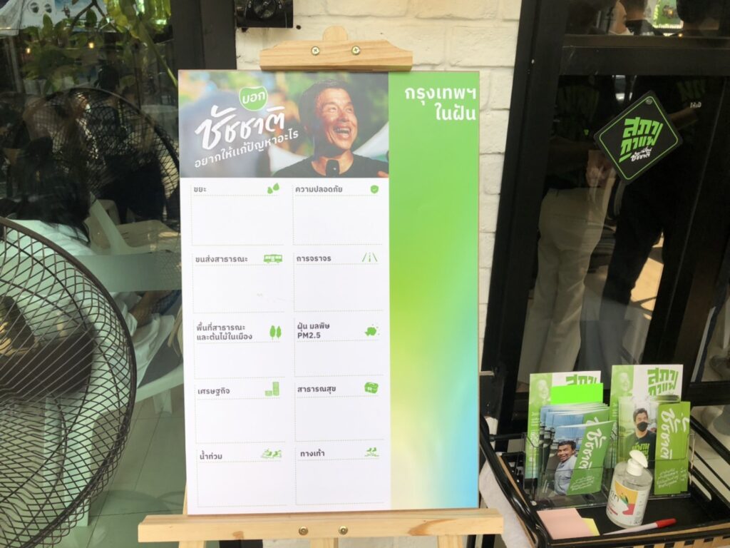 นอกจากนี้ ยังได้ทำป้ายที่เปิดโอกาสให้ประชาชนทุกคนมาร่วมแสดงความคิดเห็น โดยการใช้สติกเกอร์ติดในช่องข้อความที่ต้องการเห็นถึงความเปลี่ยนแปลง โดยตั้งเป้าในพื้นที่กรุงเทพมหานครจะต้องมีสภากาแฟ 1,000 ร้าน ใน 50 เขต และจะติดตั้งป้ายดังกล่าวไว้ให้ประชาชนร่วมแสดงความคิดเห็น รวมถึงจะมีคิวอาร์โค้ด สำหรับให้ประชาชนที่สนใจเข้าร่วมเป็นเพื่อนในกลุ่มชัชชาติ และเพื่อแจ้งปัญหามายังตนเองโดยตรงได้ หรือสามารถสะท้อนปัญหาผ่านแอปพลิเคชัน ที่ชื่อว่า Traffy Fondue ซึ่งแอปพลิเคชันดังกล่าวจะคัดแยกหมวดหมู่ปัญหา และสามารถติดตามการแก้ปัญหาได้ โดยมองว่า แอปพลิเคชันนี้จะช่วยวัดผลงานของผู้ว่า กทม. ในอนาคตได้