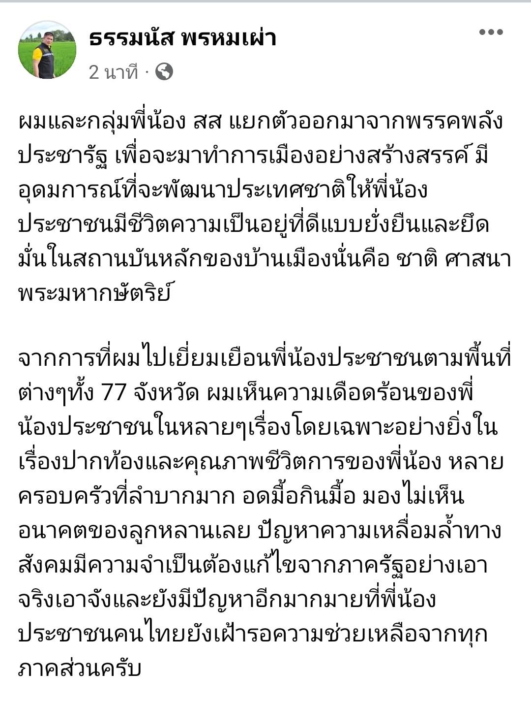 ร.อ.รรมนัส พรหมเผ่า ส.ส.พะเยา โพสต์ข้อความผ่านเพจเฟซบุ๊กส่วนตัว ว่า ผมและกลุ่มพี่น้อง ส.ส. แยกตัวออกมาจากพรรคพลังประชารัฐ เพื่อจะมาทำการเมืองอย่างสร้างสรรค์ มีอุดมการณ์ที่จะพัฒนาประเทศชาติให้พี่น้องประชาชนมีชีวิตความเป็นอยู่ที่ดีแบบยั่งยืนและยึดมั่นในสถานบันหลักของบ้านเมืองนั่นคือ ชาติ ศาสนา พระมหากษัตริย์