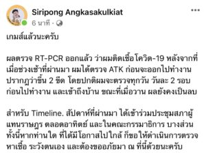 เกมแล้วนะครับ “สิริพงศ์” โพสต์เฟส แจ้งผลติดโควิด-19 หลังสัปดาห์ที่ผ่านมา ร่วมประชุมสภาผู้แทนราษฎร