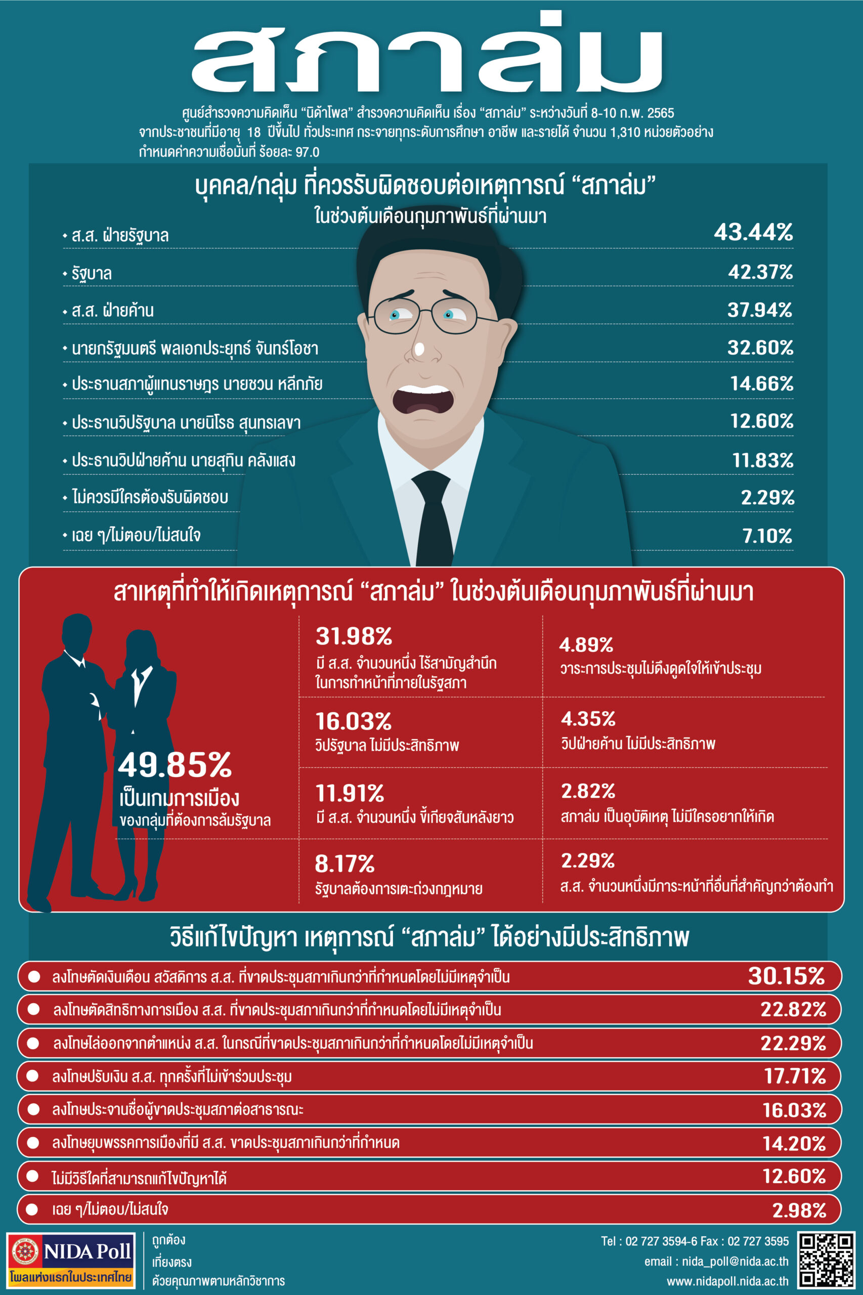 “นิด้าโพล” สถาบันบัณฑิตพัฒนบริหารศาสตร์ (นิด้า) เปิดเผยผลสำรวจของประชาชน เรื่อง “สภาล่ม” จากประชาชนที่มีอายุ 18 ปีขึ้นไป กระจายทุกภูมิภาค ระดับการศึกษาอาชีพ และรายได้ทั่วประเทศ รวมทั้งสิ้น 1,310 หน่วยตัวอย่าง เกี่ยวกับเหตุการณ์ “สภาล่ม” ในช่วงต้นเดือนกุมภาพันธ์ที่ผ่านมา เก็บข้อมูลด้วยวิธีการสัมภาษณ์ทางโทรศัพท์ โดยกำหนดค่าความเชื่อมั่น ร้อยละ 97.0 ทำการสำรวจระหว่างวันที่ 8-10 ก.พ.ที่ผ่านมา พบว่า ร้อยละ 43.44 ระบุว่า บุคคล/กลุ่ม ที่ควรรับผิดชอบต่อเหตุการณ์ “สภาล่ม” คือ ส.ส. ฝ่ายรัฐบาล,ร้อยละ 42.37 ระบุ รัฐบาล, ร้อยละ 37.94 ระบุ ส.ส. ฝ่ายค้าน, ร้อยละ 32.60 ระบุ นายกรัฐมนตรี, ร้อยละ 14.66 ระบุ ประธานสภาผู้แทนราษฎร ร้อยละ 12.60 ระบุ ประธานวิปรัฐบาล, ร้อยละ 11.83 ระบุ ประธานวิปฝ่ายค้าน, ร้อยละ 2.29 ระบุ ไม่ควรมีใครต้องรับผิดชอบ และร้อยละ 7.10 ระบุ เฉย ๆ/ไม่ตอบ/ไม่สนใจ