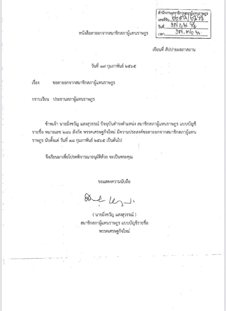 “มิ่งขวัญ แสงสุวรรณ” ประกาศลาออก สส.กลางสภา ชี้พรรคเศรษฐกิจใหม่อุดมการณ์ต่าง ฉะปมลิงกินกล้วย