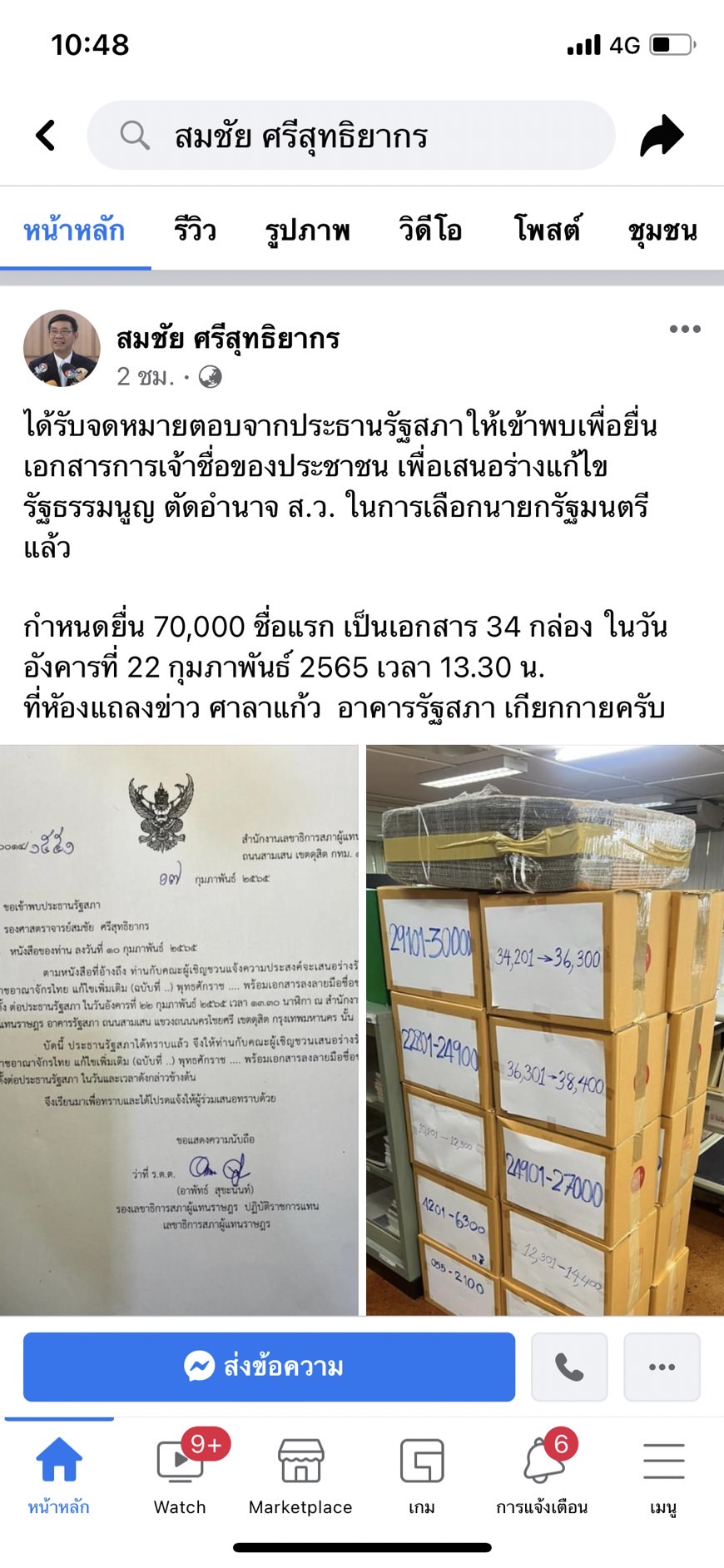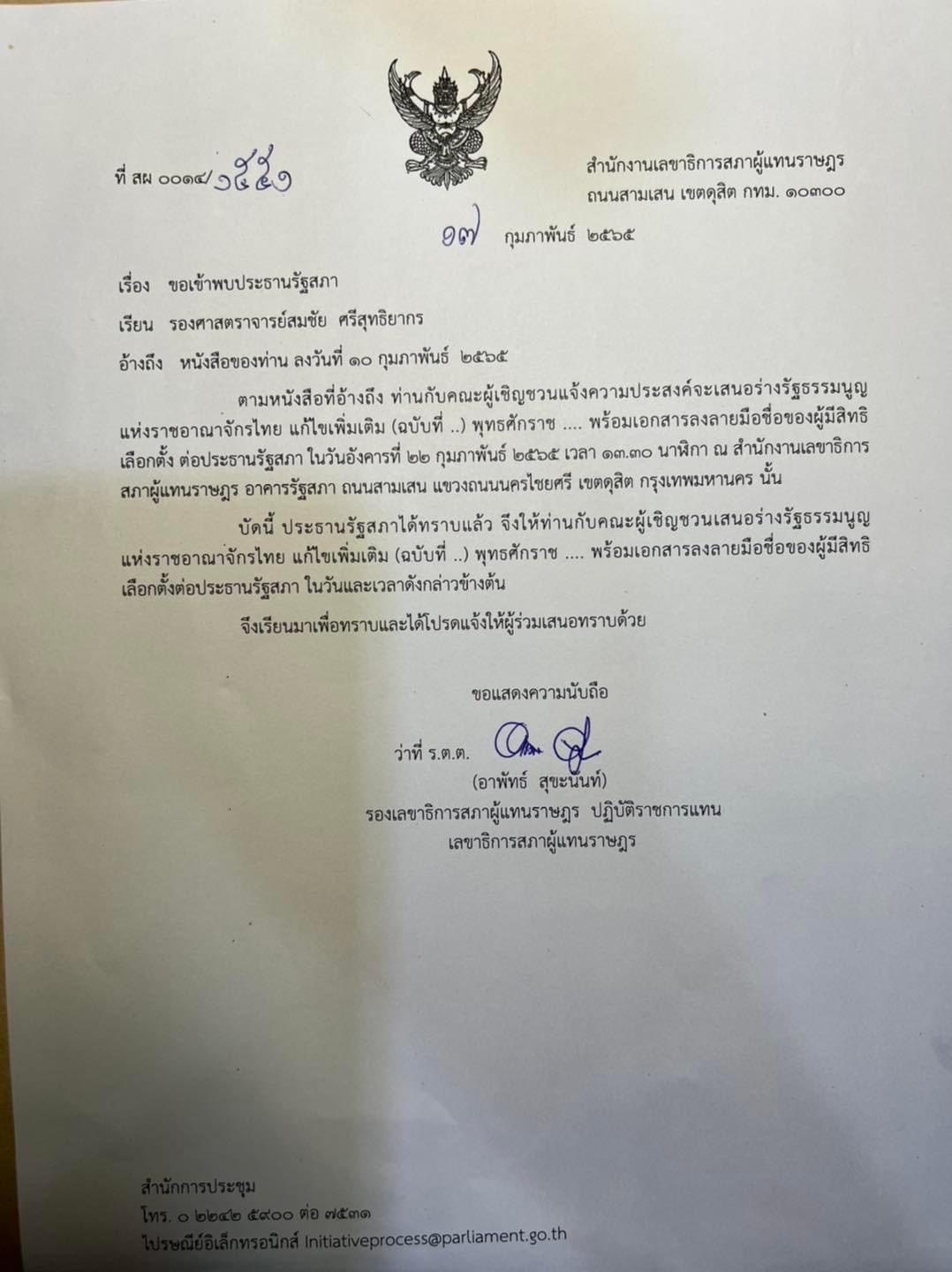 รศ.สมชัย ศรีสุทธิยากร หนึ่งในคณะผู้ริเริ่มสนอร่างแก้ไขรัฐธรรมนูญ ตัดอำนาจ ส.ว. ในการเลือกนายกรัฐมนตรี โพสต์ข้อความผ่านเฟซบุ๊ค ว่า ได้รับจดหมายตอบจากประธานรัฐสภาให้เข้าพบ เพื่อยื่นเอกสารการเจ้าชื่อของประชาชน เพื่อเสนอร่างแก้ไขรัฐธรรมนูญ ตัดอำนาจ ส.ว. ในการเลือกนายกรัฐมนตรี แล้วกำหนดยื่น70,000 ชื่อแรก เป็นเอกสาร 34 กล่อง ในวันอังคารที่ 22 กุมภาพันธ์ 2565 เวลา 13.30 น.ที่ห้องแถลงข่าว ศาลาแก้ว อาคารรัฐสภา เกียกกาย