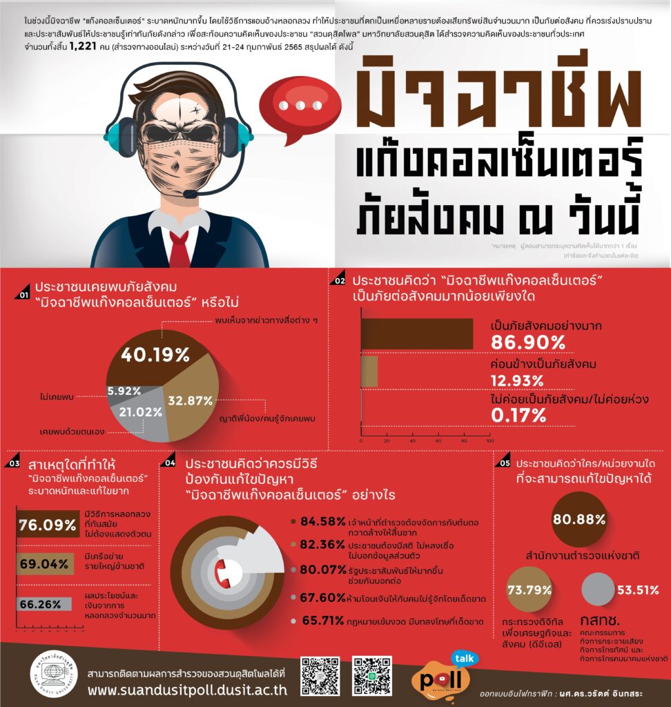 สวนดุสิตโพล มหาวิทยาลัยสวนดุสิต สำรวจความคิดเห็นของประชาชนทั่วประเทศ จำนวนทั้งสิ้น 1,221 คน เรื่อง มิจฉาชีพแก๊งคอลเซ็นเตอร์” ภัยสังคม ณ วันนี้