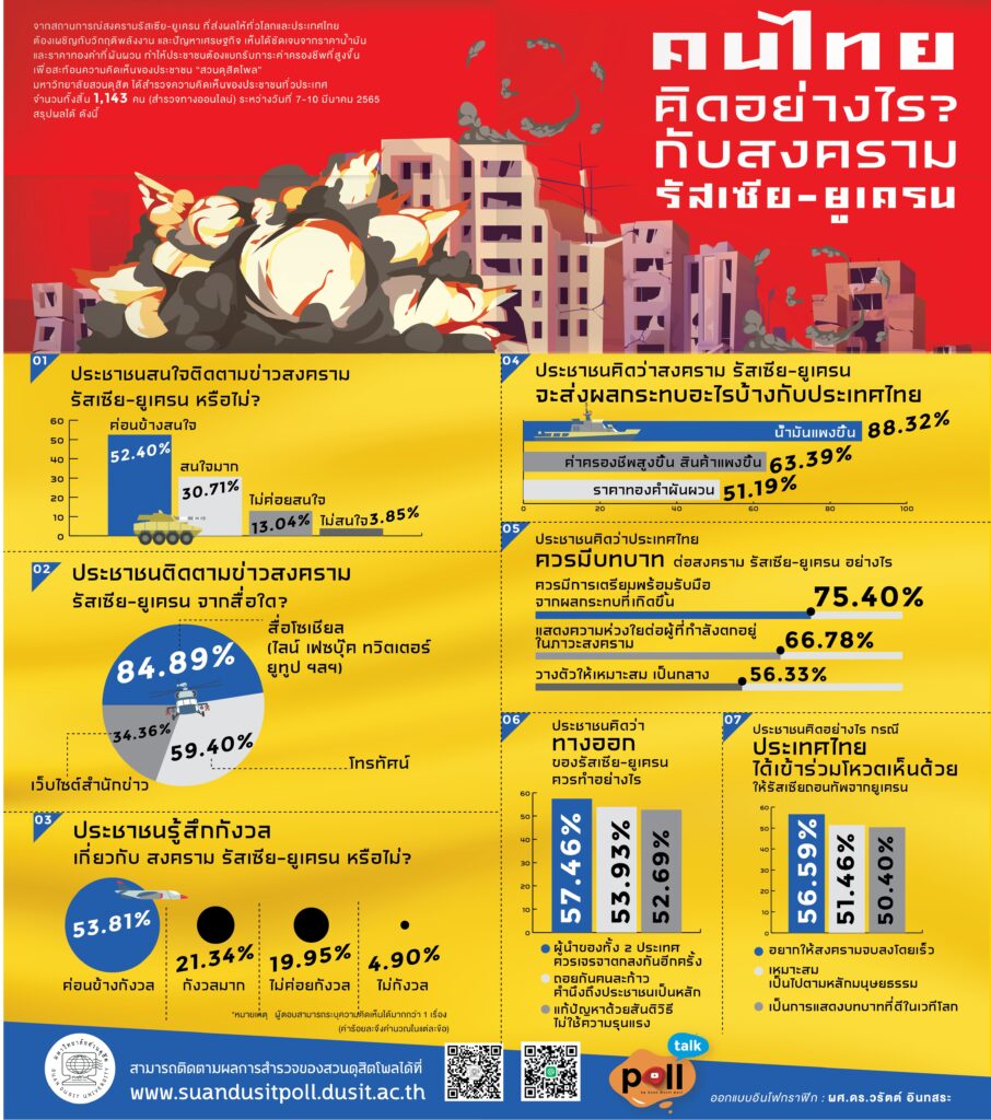 สวนดุสิตโพล มหาวิทยาลัยสวนดุสิต สำรวจความคิดเห็นของประชาชนทั่วประเทศ จำนวน 1,143 คน ระหว่างวันที่ 7-10 มีนาคม 2565พบว่า ประชาชนส่วนใหญ่สนใจติดตามข่าวสงคราม รัสเซีย-ยูเครน โดย ร้อยละ 52.40 ระบุว่า ค่อนข้างสนใจ รองลงมา ร้อยละ 30.71 ระบุว่า สนใจมาก ร้อยละ13.04 ระบุว่า ไม่ค่อยสนใจ
