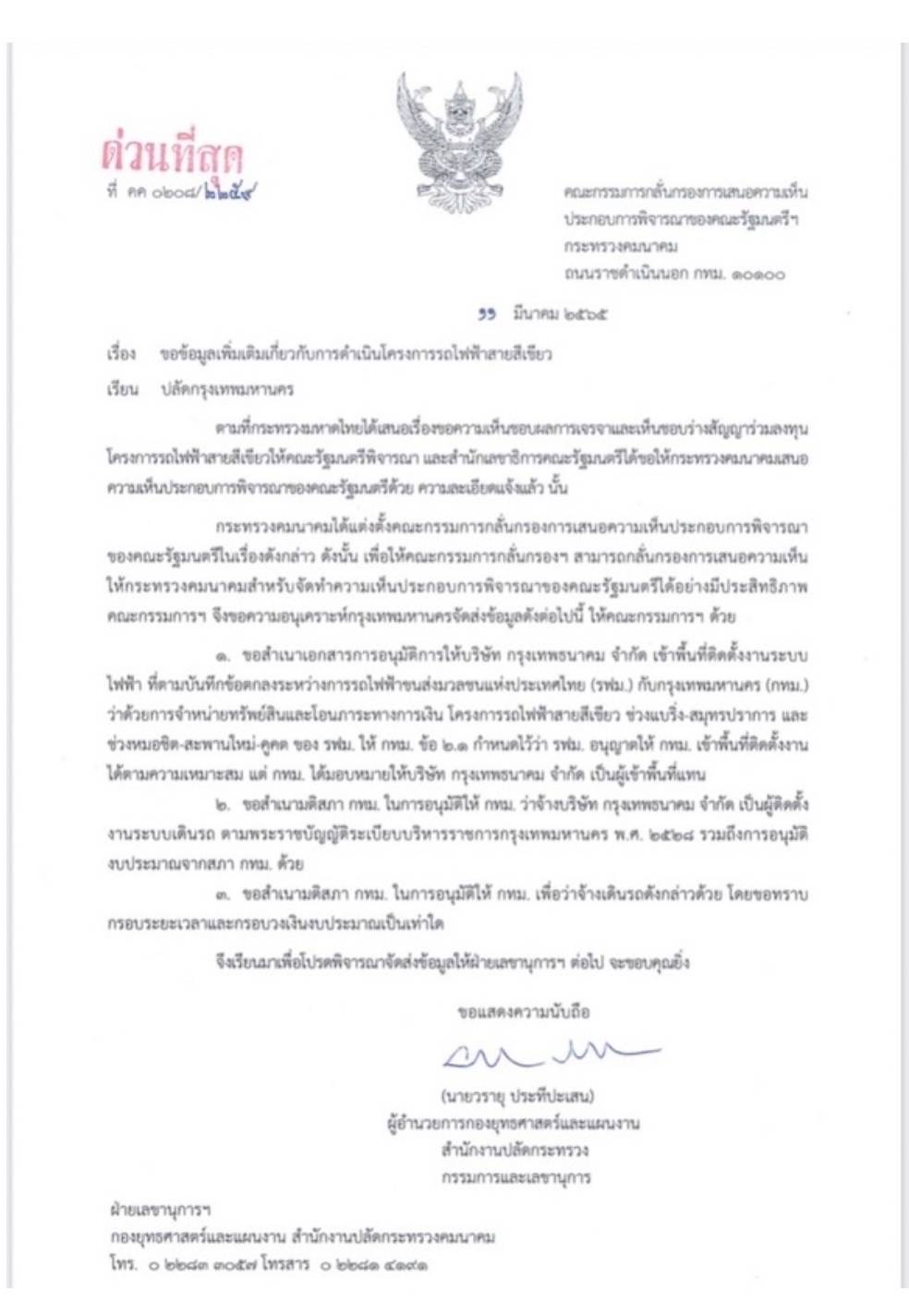 เปิดหนังสือด่วน ! คมนาคม จี้ ปลัดกรุงเทพมหานคร ขอสำเนามติ สภา กทม.จ้าง “กรุงเทพธนาคม” ติดตั้งระบบ-ว่าจ้างเดินรถไฟฟ้าสายสีเขียว ก่อนทำความเห็นประกอบเสนอ ครม. อีกครั้ง