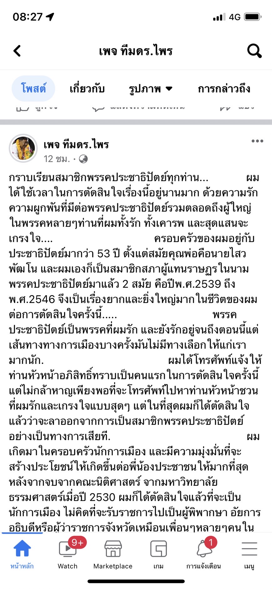 นายไพร พัฒนโน โพสต์ข้อความผ่านเฟซบุ๊กแฟนเพจทีม ดร.ไพร ว่า กราบเรียนสมาชิกพรรคประชาธิปัตย์ทุกท่าน… ผมได้ใช้เวลาในการตัดสินใจเรื่องนี้อยู่นานมากด้วยความรัก ความผูกพันที่มีต่อพรรคประชาธิปัตย์รวมตลอดถึงผู้ใหญ่ในพรรคหลายๆท่านที่ผมทั้งรัก ทั้งเคารพ และสุดแสนจะเกรงใจ….